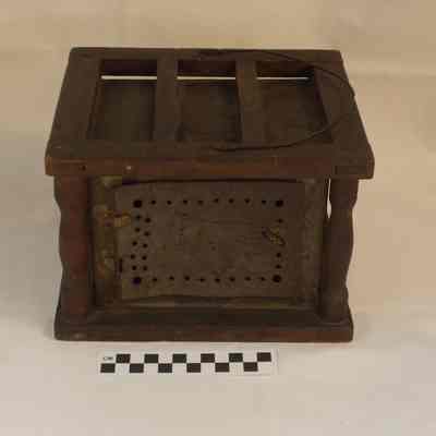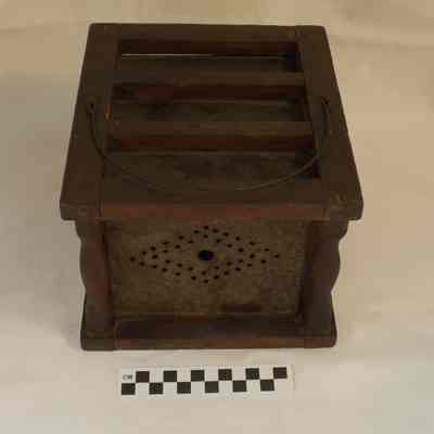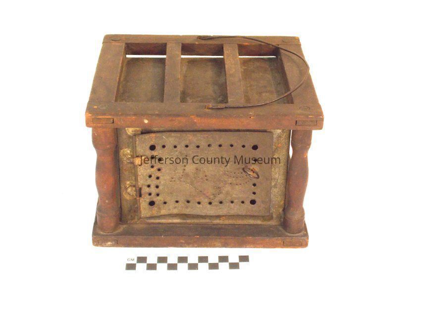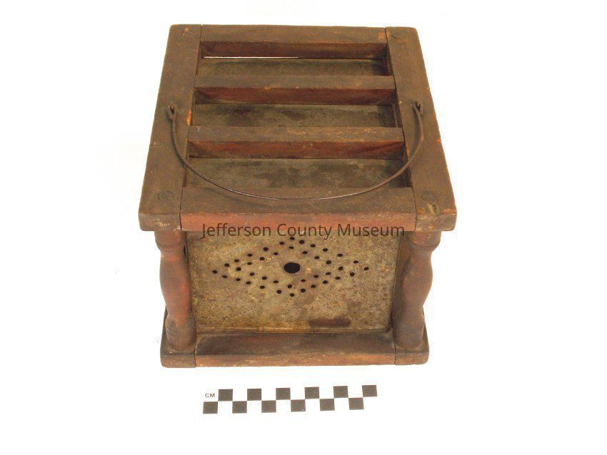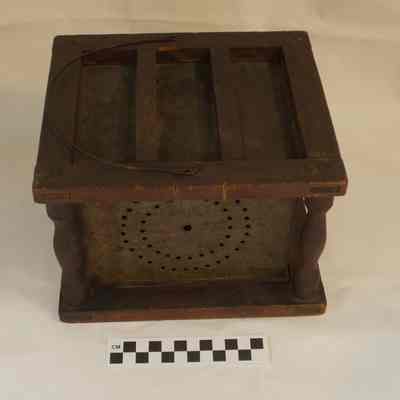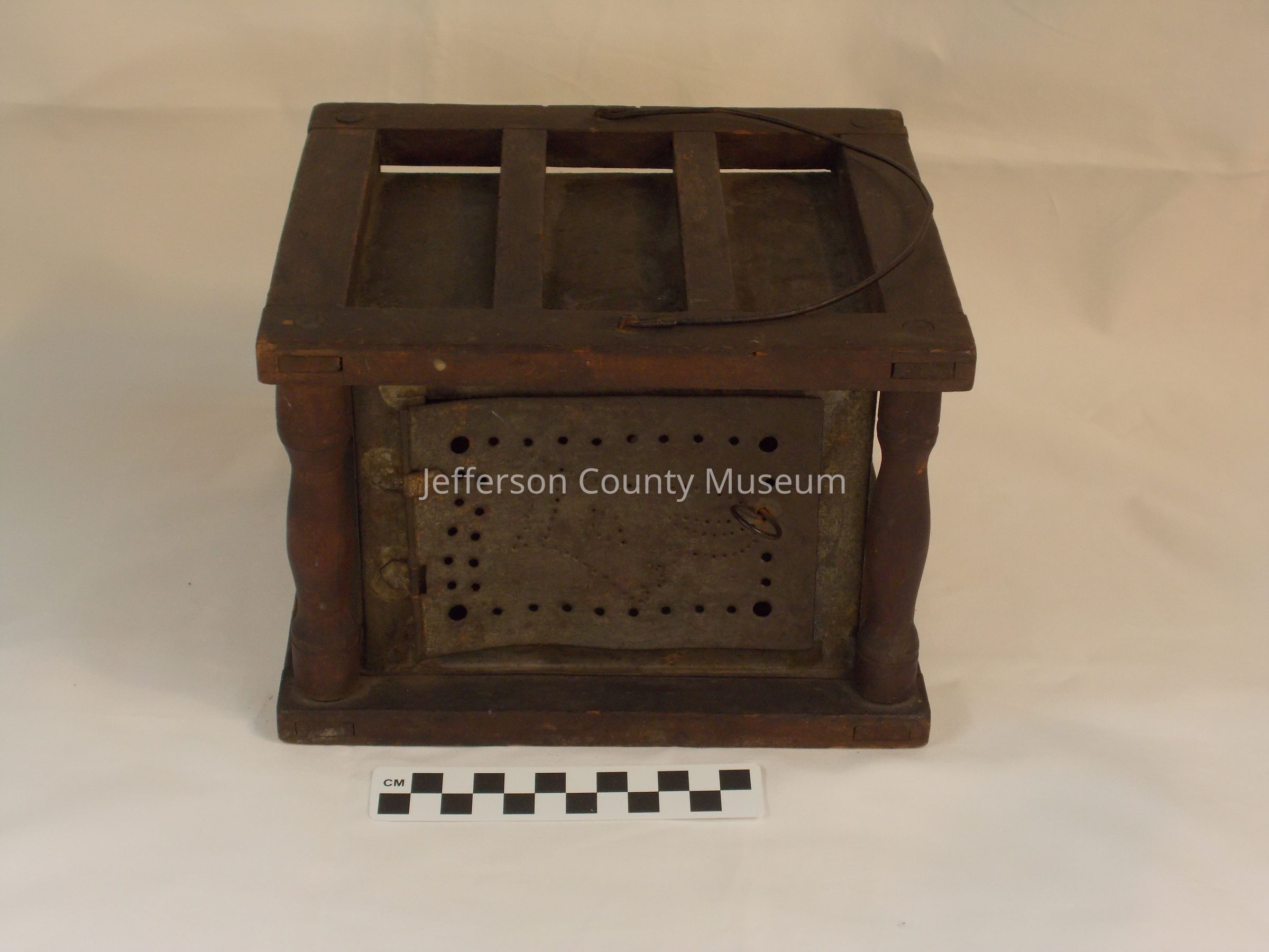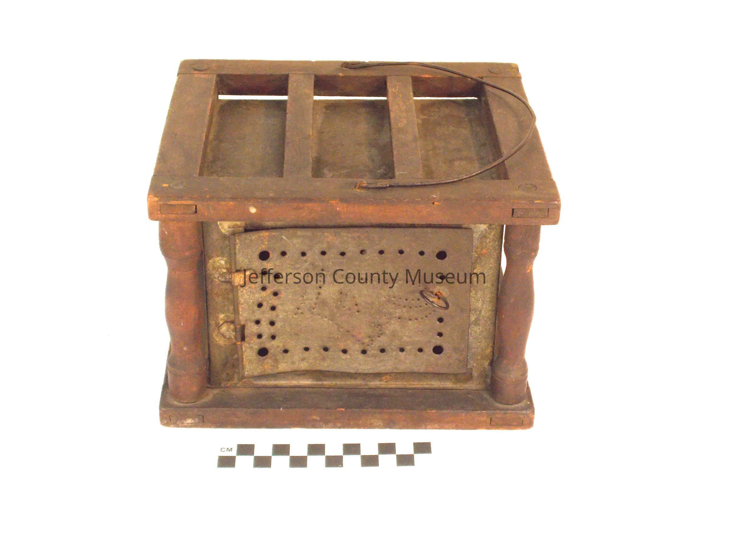 Tin and wood foot warmer with rare punched decoration in metal. Door has holes punched in shape of hand with fingers holding latch. Wire handle for carrying. American, circa 1830-1850.Acquisition