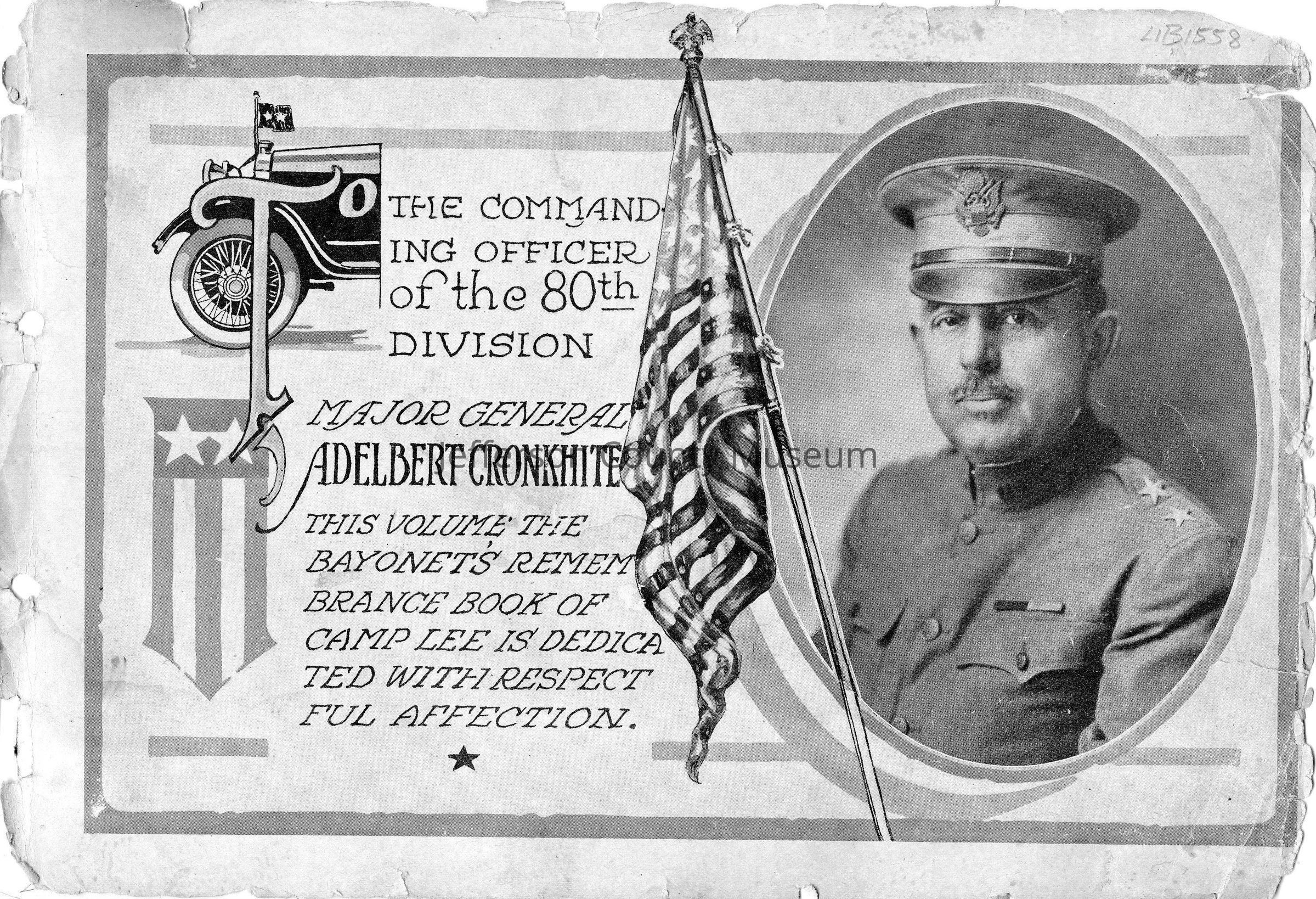 Unbound paper covered booklet "TO THE COMMANDING OFFICER OF THE 80TH DIVISION MAJOR GENERAL ADELBERT CRONKHITE THIS VOLUME THE BAYONET'S REMEMBRANCE BOOK OF CAMP LEE IS DEDICATED WITH RESPECTFUL AFFECTION". Photo of Cronkhite on cover. Book is stapled together. This copy is missing front and back cover and several pages. For a complete copy, see LIB1559.Acquisition