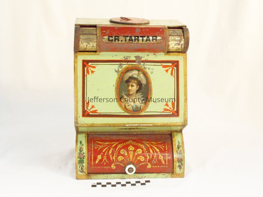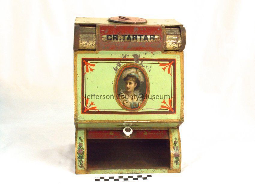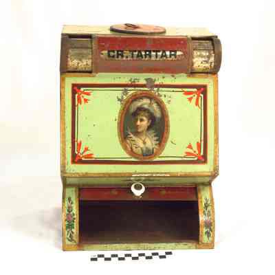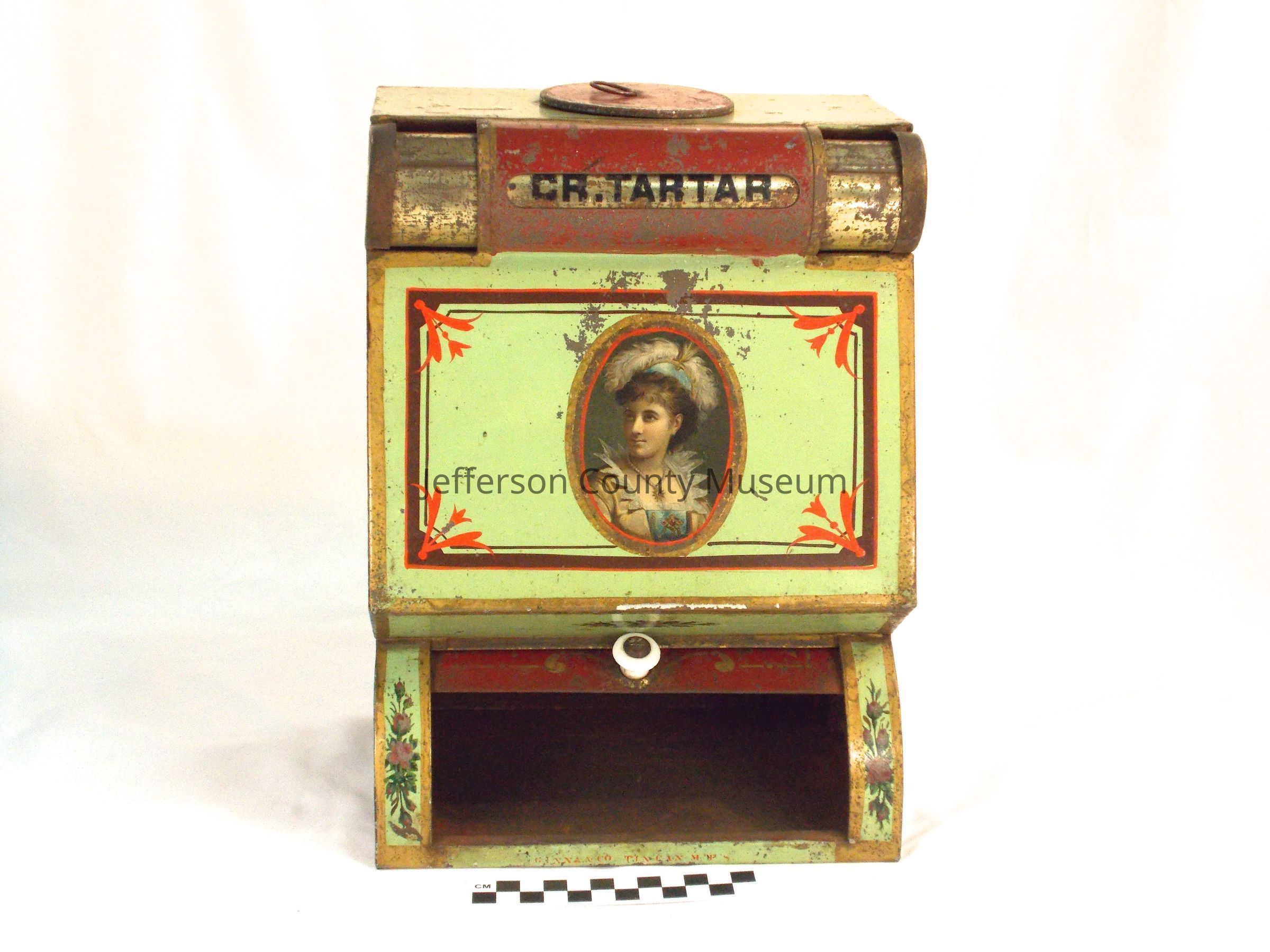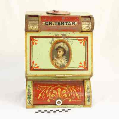 Decorated tin canister for spices. Sliding door at bottom with white porcelain knob. Decorated with stenciling and decals including a picture of a woman in a feathered hat. On top "GINN & CO. PATENTED SEP. 18 NOV. 6 & 13 1877 REISSUED MAY 21, 1878. NEW YORK".Acquisition