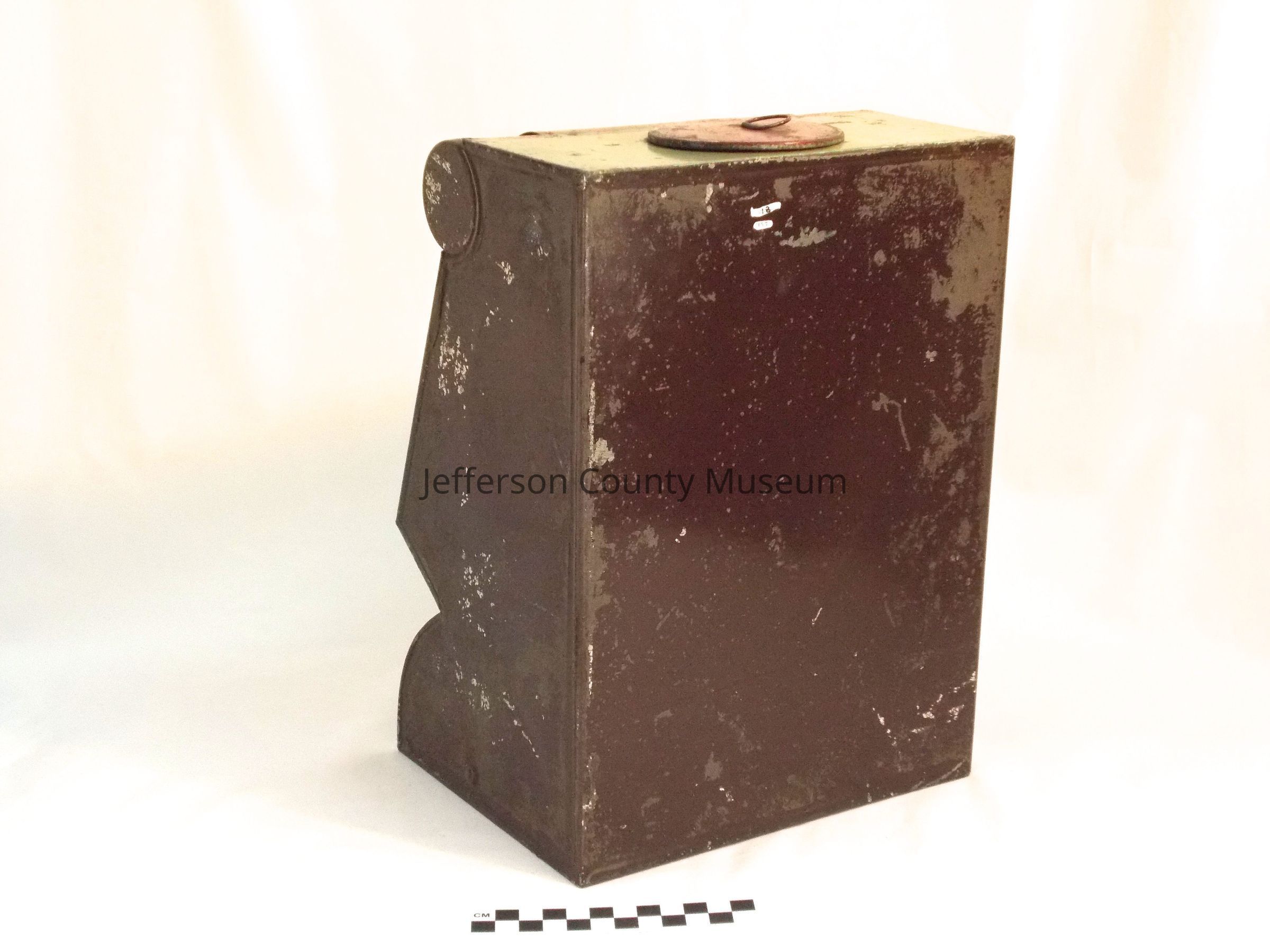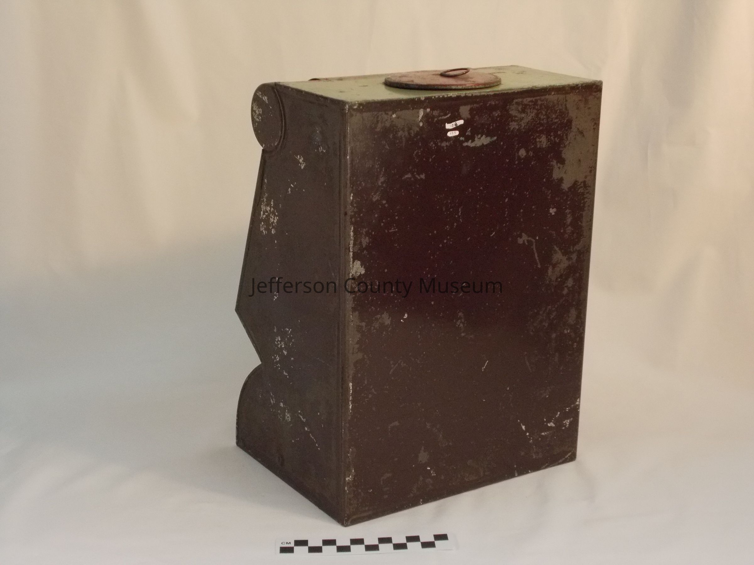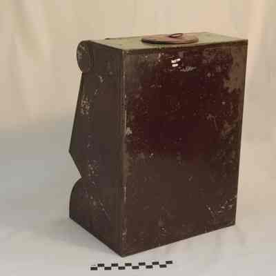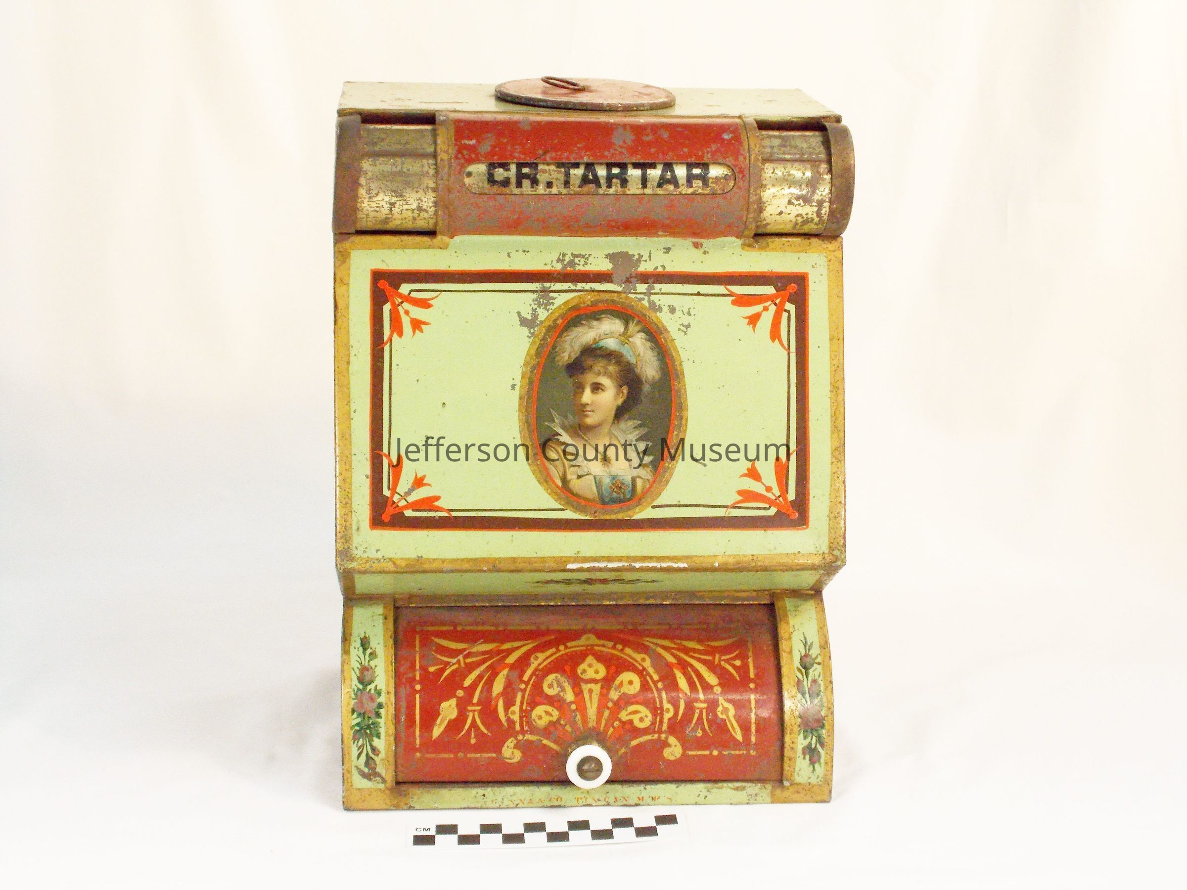 Decorated tin canister for spices. Sliding door at bottom with white porcelain knob. Decorated with stenciling and decals including a picture of a woman in a feathered hat. On top "GINN & CO. PATENTED SEP. 18 NOV. 6 & 13 1877 REISSUED MAY 21, 1878. NEW YORK".Acquisition