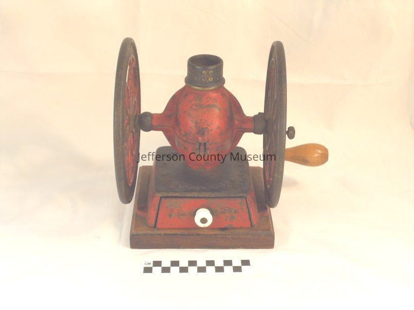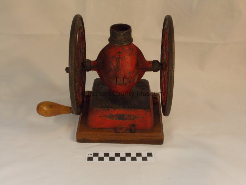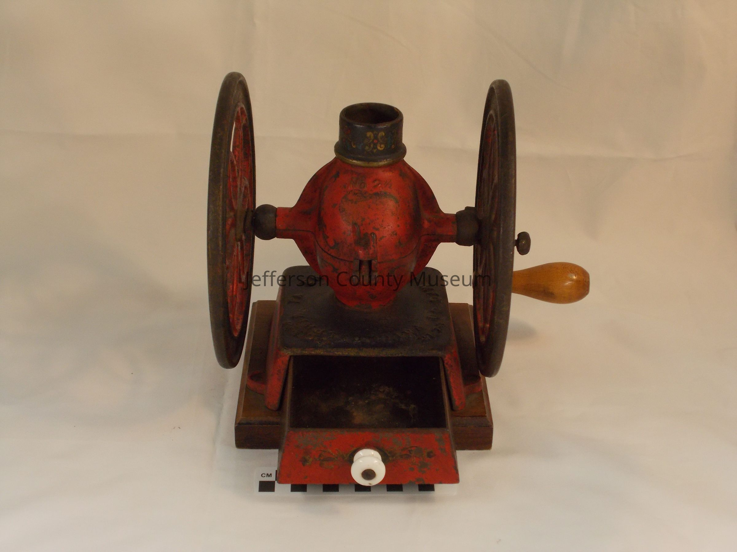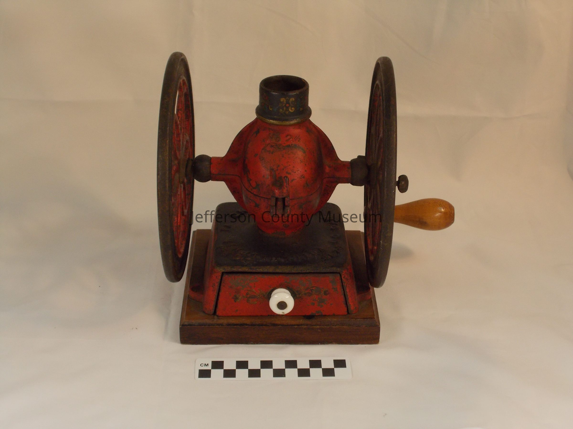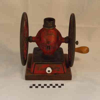 Cast iron coffee grinder on wood base, top missing. Wood crank handle on right wheel. Painted red. On base of body "ENTERPRISE MFG CO. PHILADELPHIA. PA PAT OCT 21. 73" On each wheel "ENTERPRISE MFG CO PHILADELPHIA PA PAT. DEC 5, 1873".Acquisition