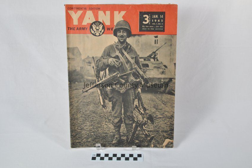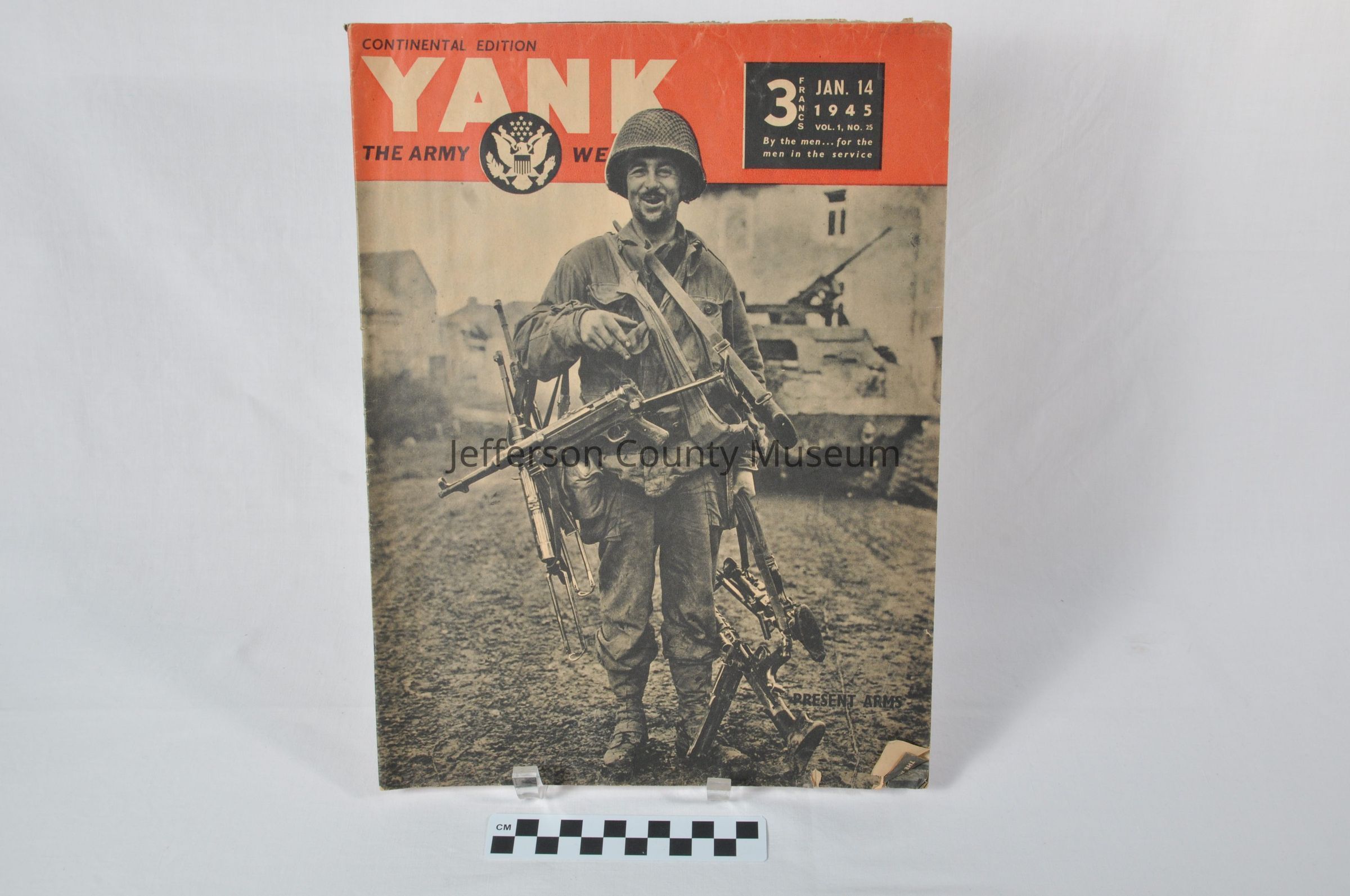"YANK CONTINENTAL EDITION THE ARMY WEEKLY JAN. 14, 1945" Shows photo of soldier with many captured weapons hanging on his body. Tank in background. Vol. 1, No. 25.Acquisition
