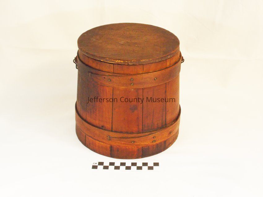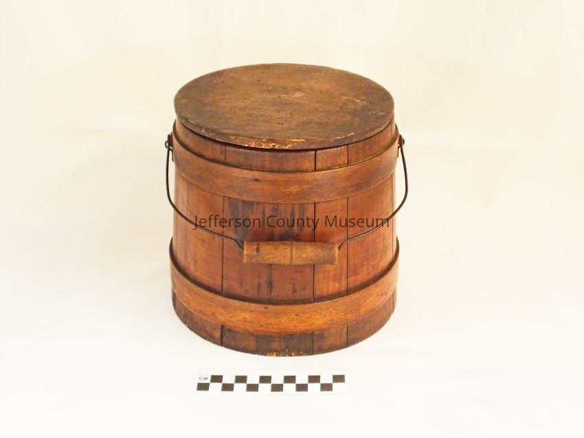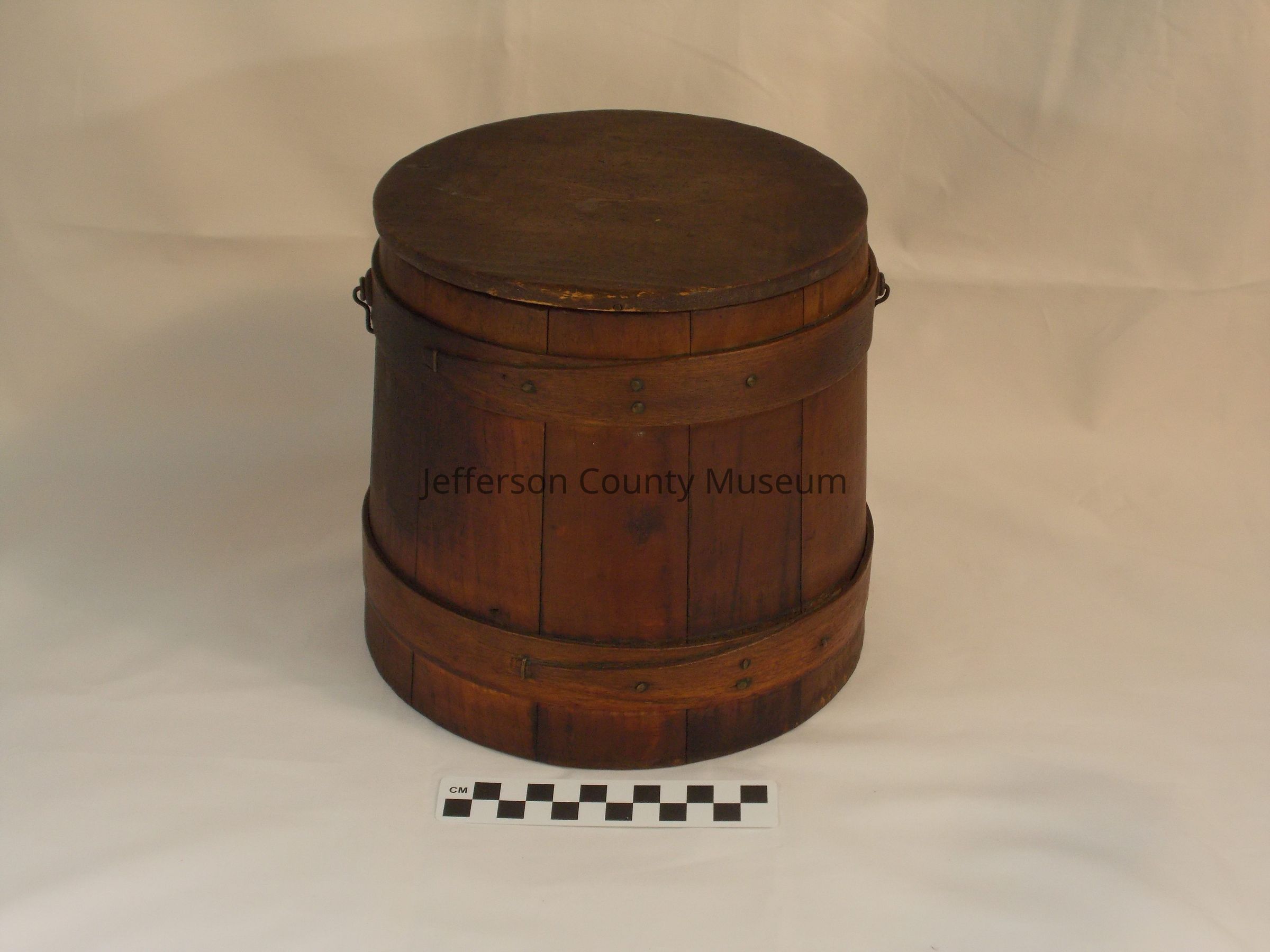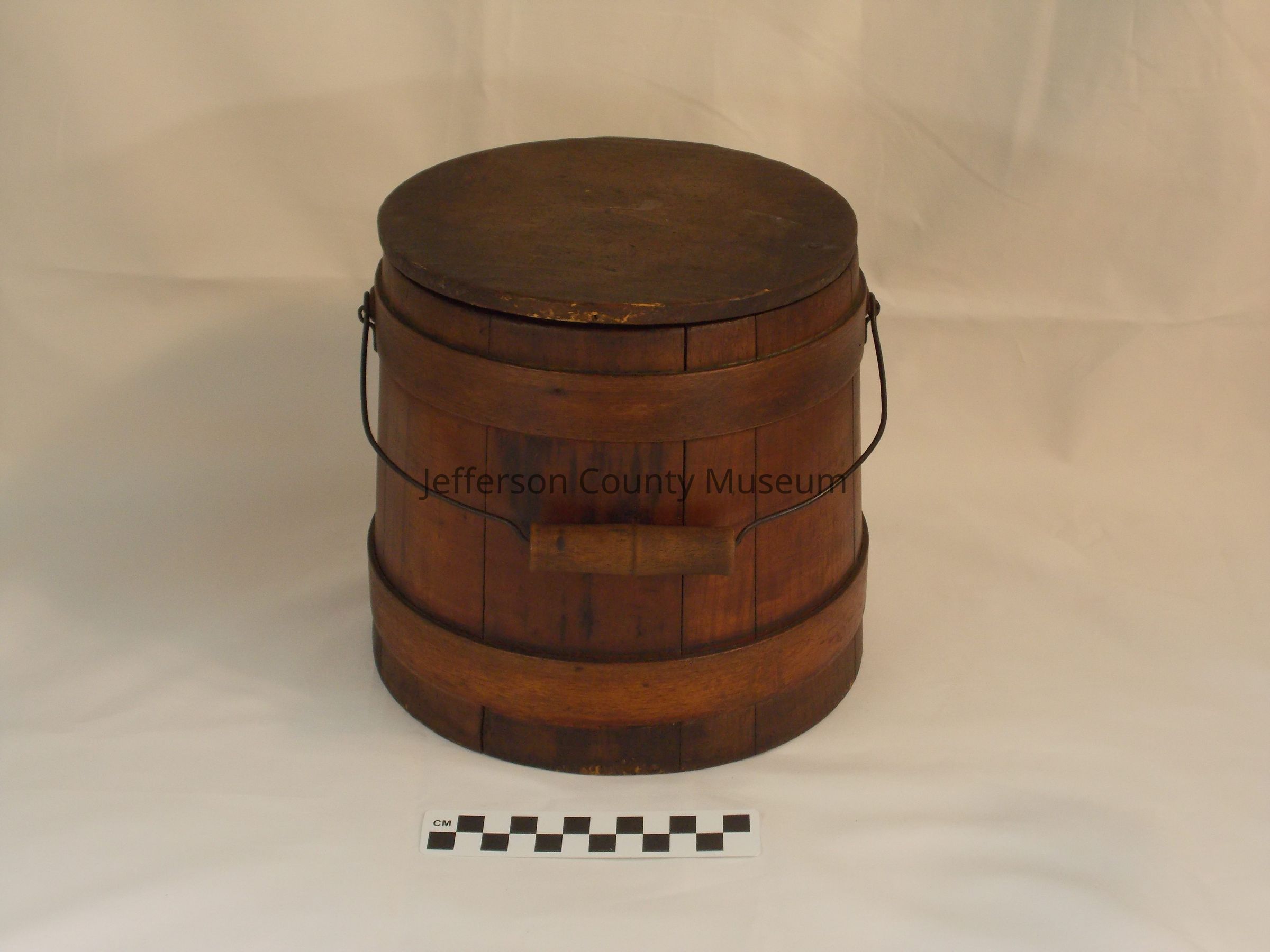 Wood sugar bucket with lid. Wire handle with wood piece for hand.