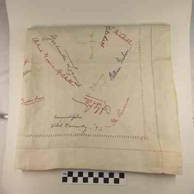 Linen "signature" cloth from the Bower, circa 1900. Among the names are Thomas Nelson Page (author), George W. Peterkin, first Episcopal Bishop of West Virginia, and members of the Dandridge, Pendleton, and Lee families. Names are entered in "People" section.