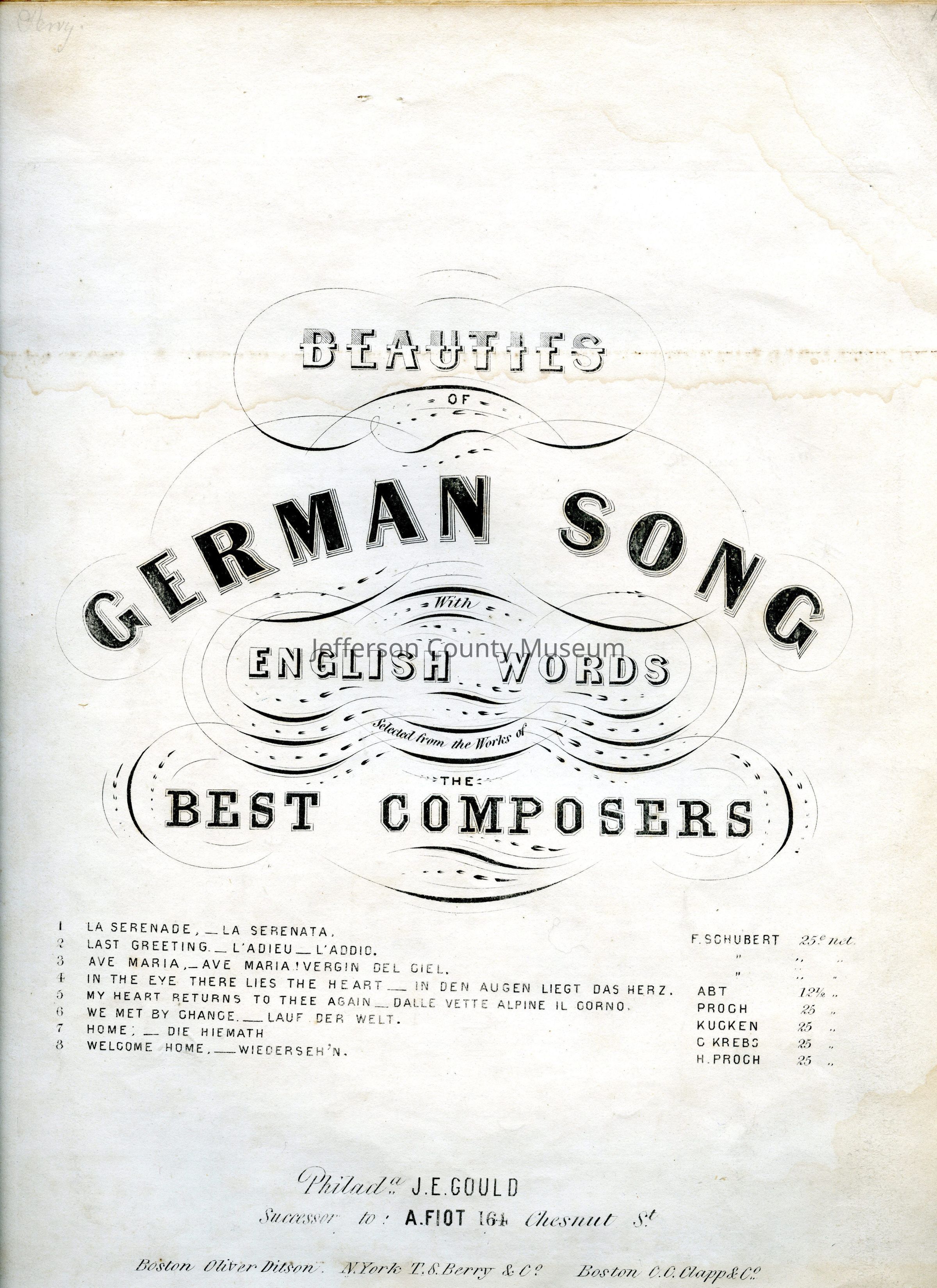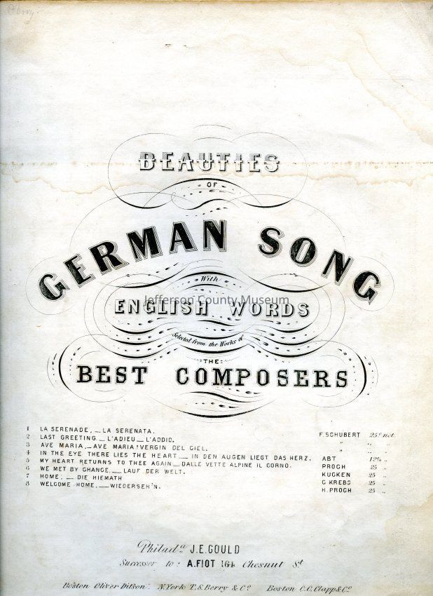 Book of sheet music compiled from many published sources. Each compilation from a publisher has a cover page. Publication dates range from 1849 to 1856. Pages are hand-numbered consecutively in pencil at the top right. Located on melodeon (catalog number 1210).