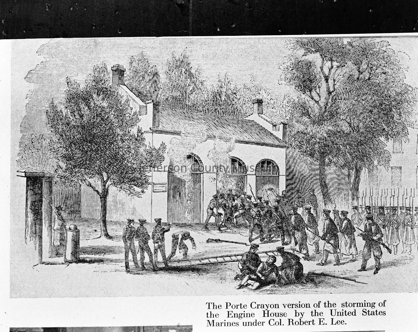 Storming of the engine house or John Brown's fort by the U. S. Marines under Col. Robert E. Lee. Drawing by Port Crayon [alias of David Hunter Strother].