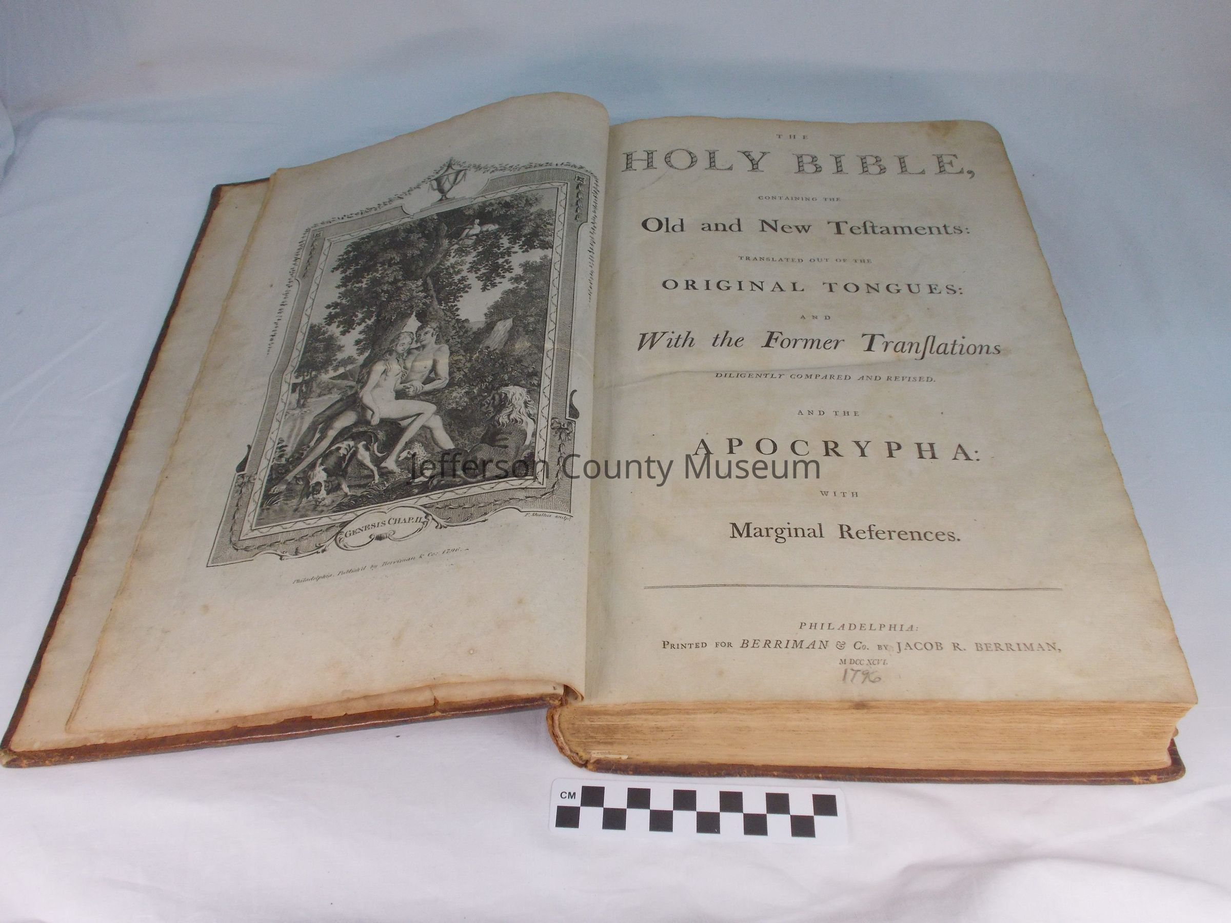 Leather-bound McCurdy family Bible with Old & New Testaments and the Apocrypha with steel engravings throughout. Printed in Philadelphia in 1796 By Jacob R. Berriman.Acquisition