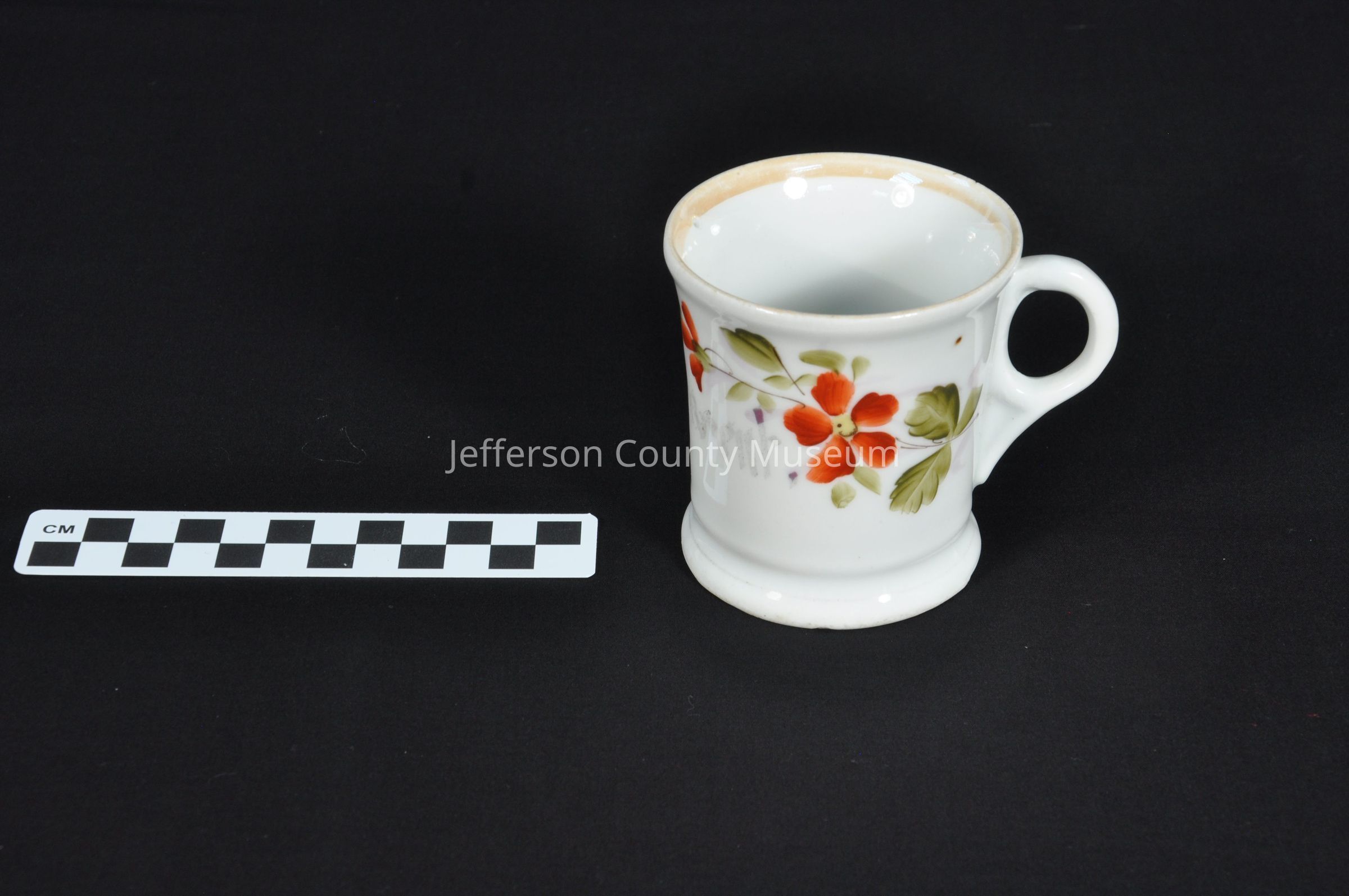 White mug with red floral design and green leaves. Inside rim has darker beige color. Painted under flowers is "A present". On bottom is round mark with "MADE IN GERMANY" inside it.Acquisition