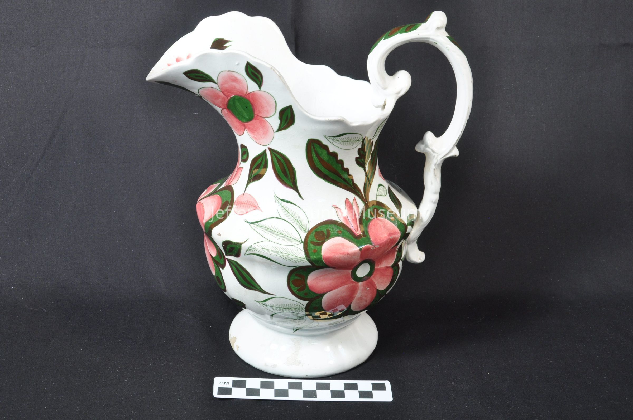 Tin-glazed pitcher, wide mouthed, scalloped spout. White with green and rose colors.