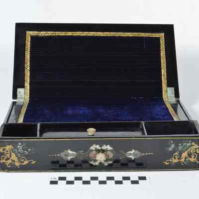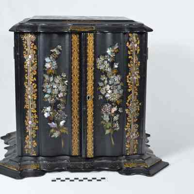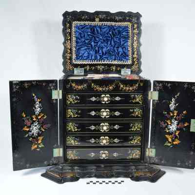 Multi-drawered,rectangular papier mache sewing cabinet. Lid is hinged to reveal a segmented, blue-lined drawer which further covers white-lined cubbyholes underneath. Two side doors open to show 4 drawers with mother of pearl pulls. The fifth and bottom drawer is actually a lap desk that pulls out. Cabinet is black with painted decorations, largely gold or multi-colored flowers. The back is painted with a gold lilac spray, flanked by 2 mirror-imaged twining flowering vines. The lid is inlayed with mother of pearl. It is lined inside with blue silk which has been gathered and bordered with white and gold braid draped in loops.Acquisition