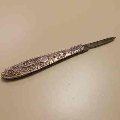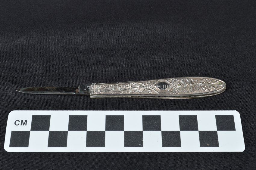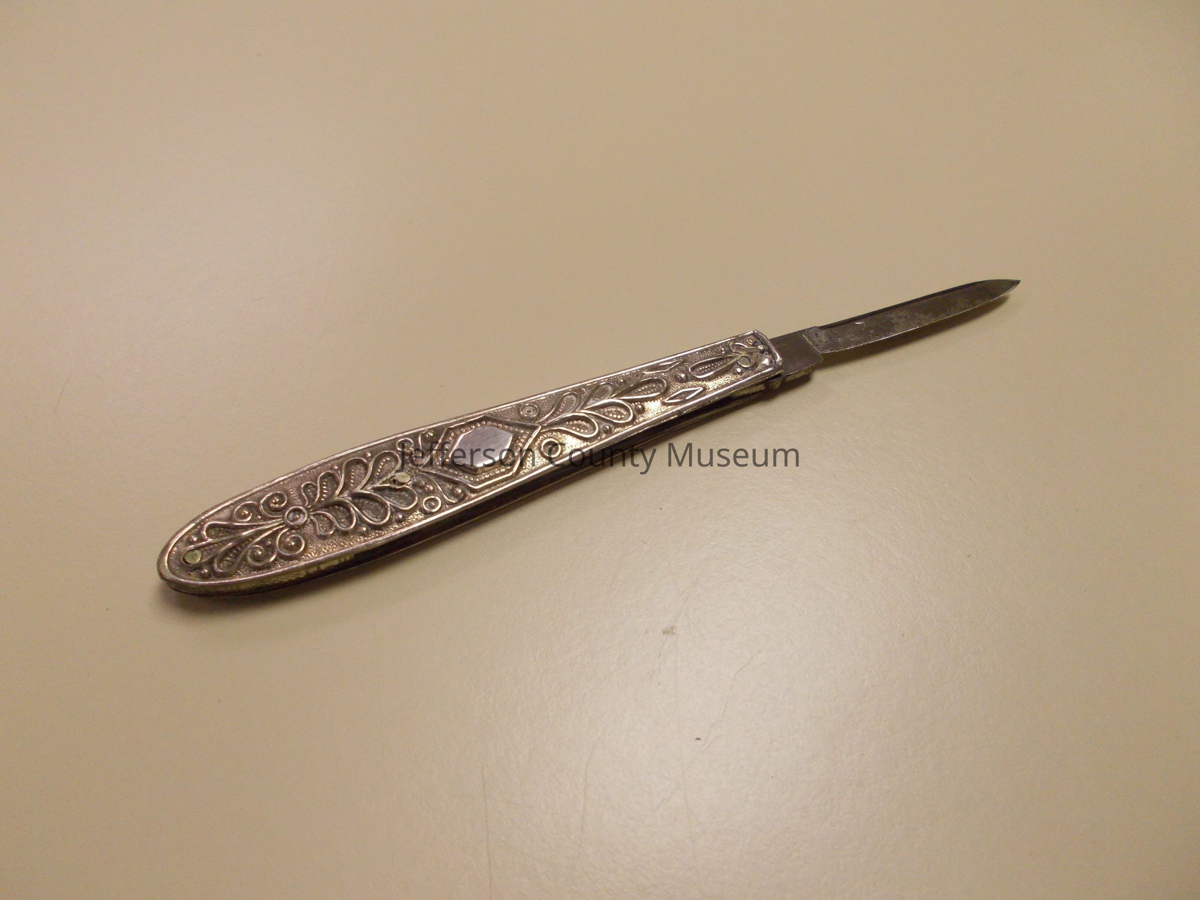 Small, thin-bladed knife of light-weight, silver-colored metal. Hallmark on blade hilt is a crown with "R" to its right. The letter to the left of the crown is partly worn away.Acquisition