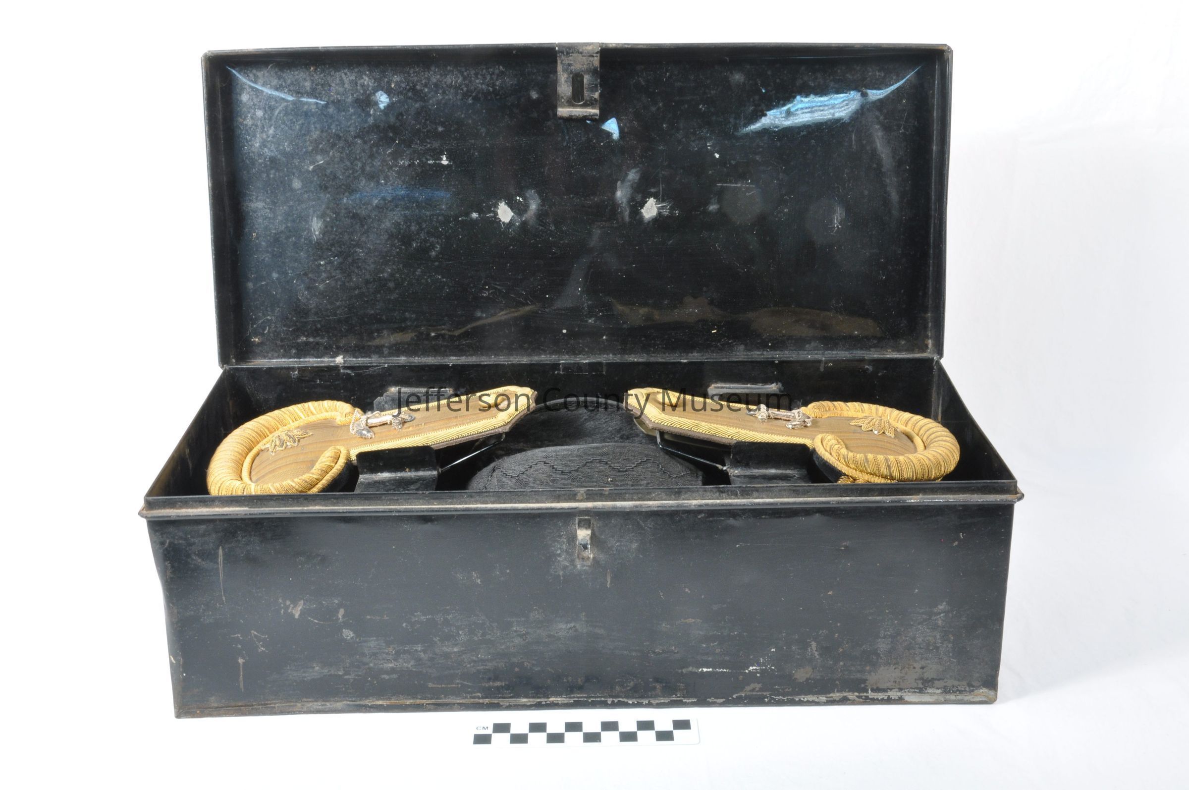 Epaulets and an admiral's hat in a black tin boxEntry/Object ID