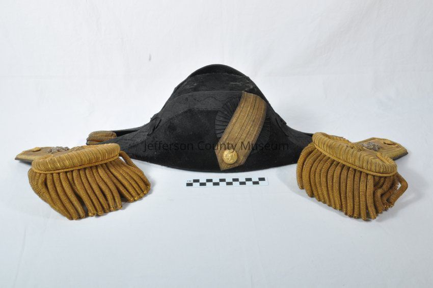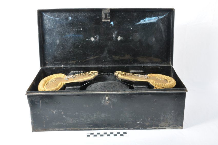 Epaulets and an admiral's hat in a black tin box; probably World War I. 624a - box; 624b - epaulet; 624 - epaulet; 624d - hat. There are random metal components loose in the bottom of the box. Unidentfied.Acquisition