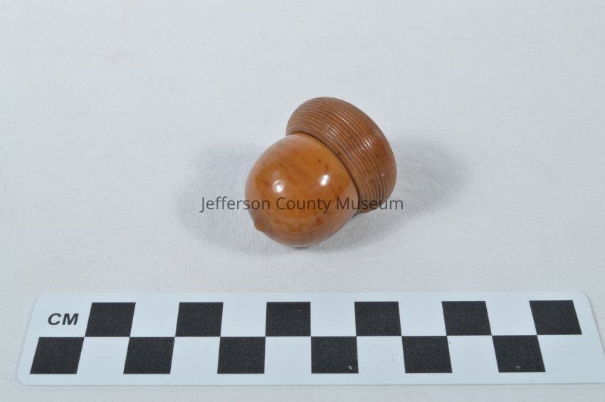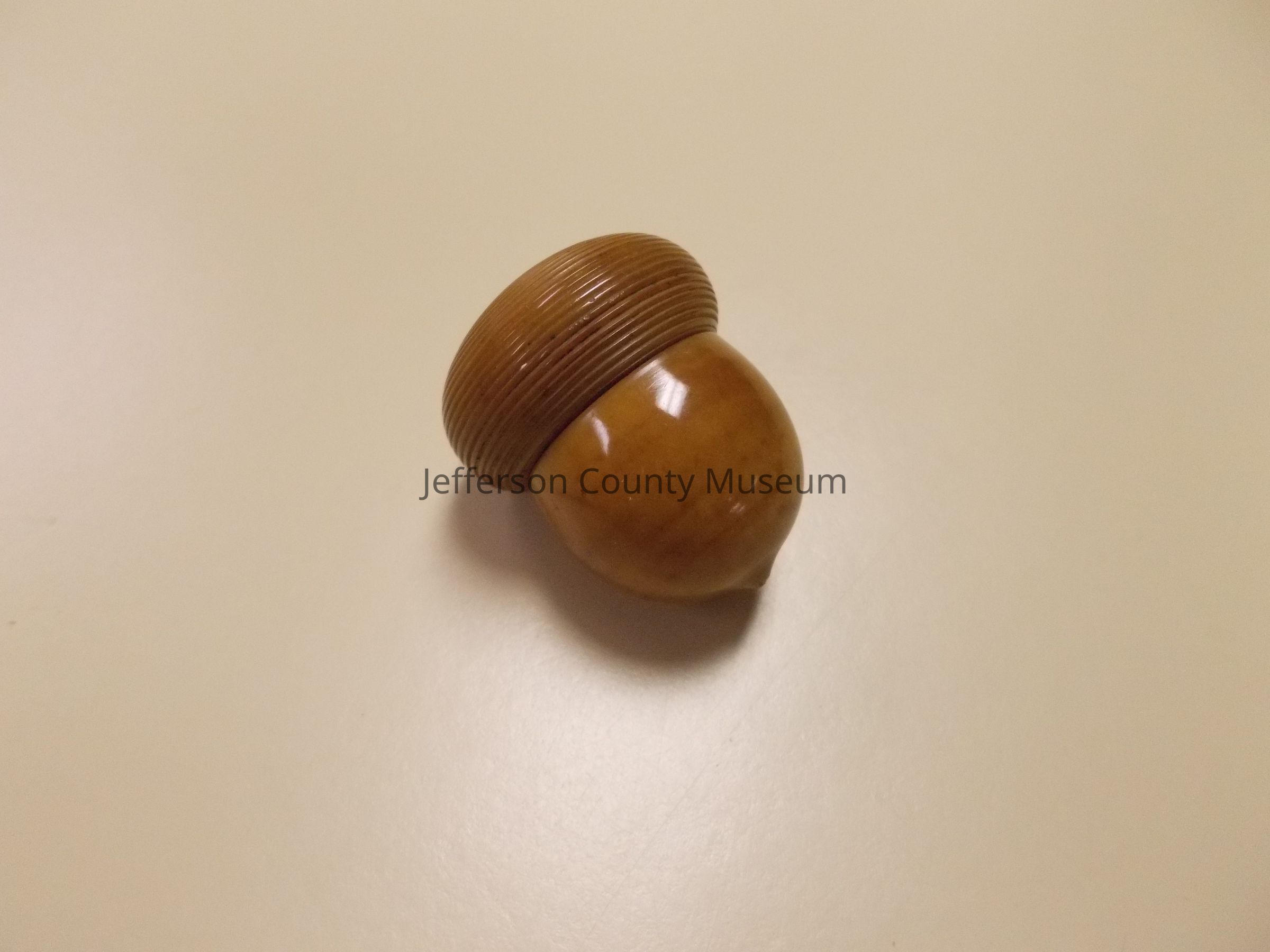 Acorn-shaped needle holder. Top is wood and has thin grooves for gripping. Bottom appears to be a composite or plastic material. Over half of the threads to hold the lid on are broken off.