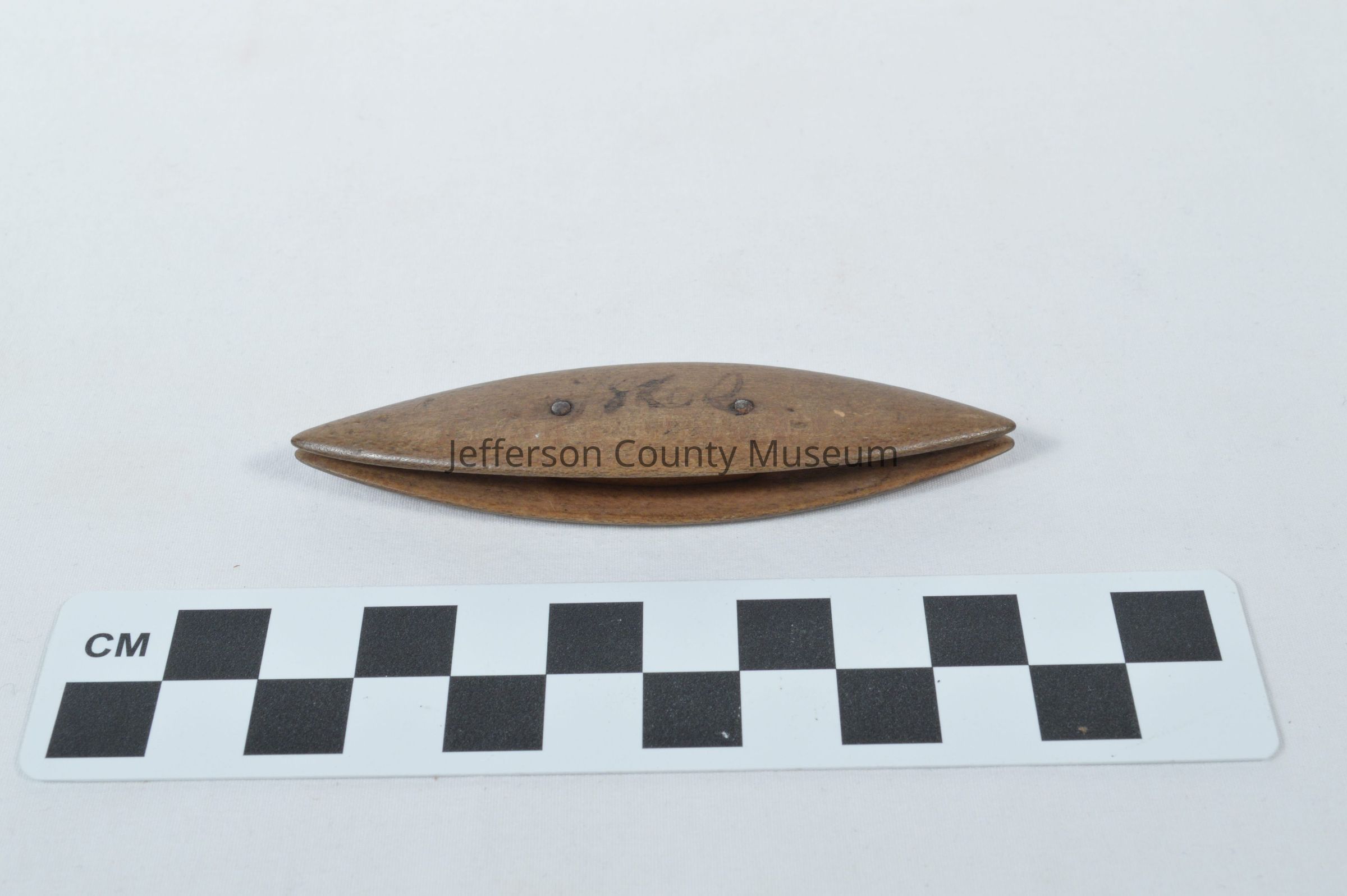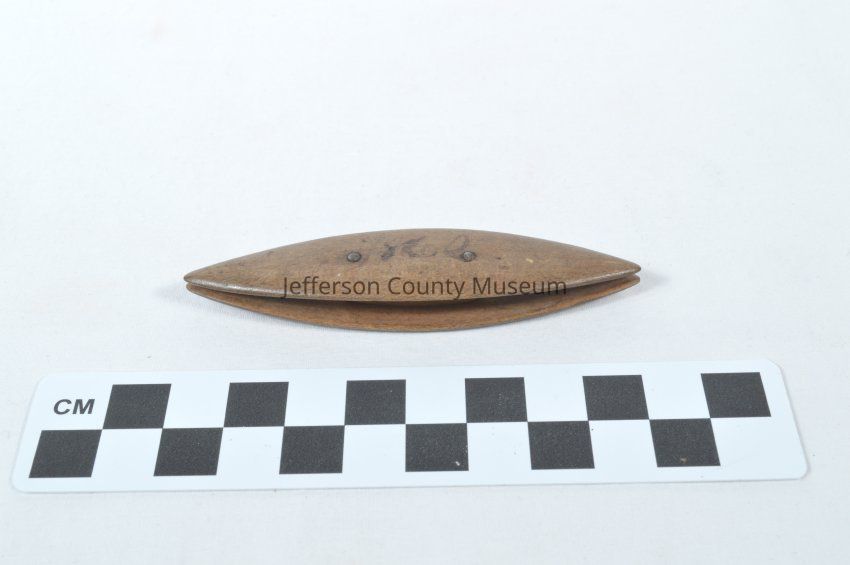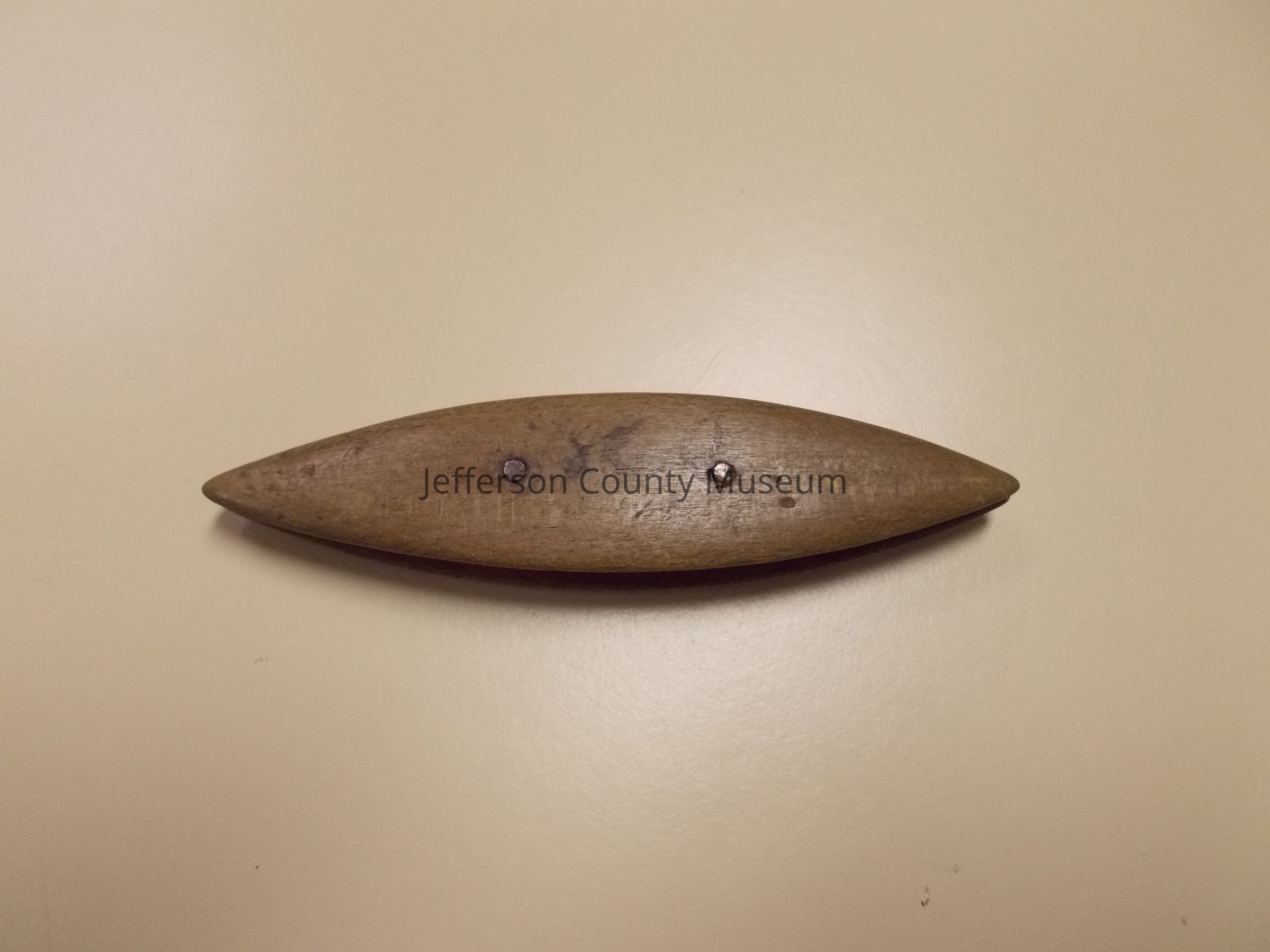 Wooden tatting shuttle. Brown wood with elongated oval shape. Marked "1860" on one side and "1862" on other. Two metal pins connect the two sides.Acquisition