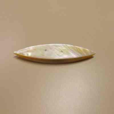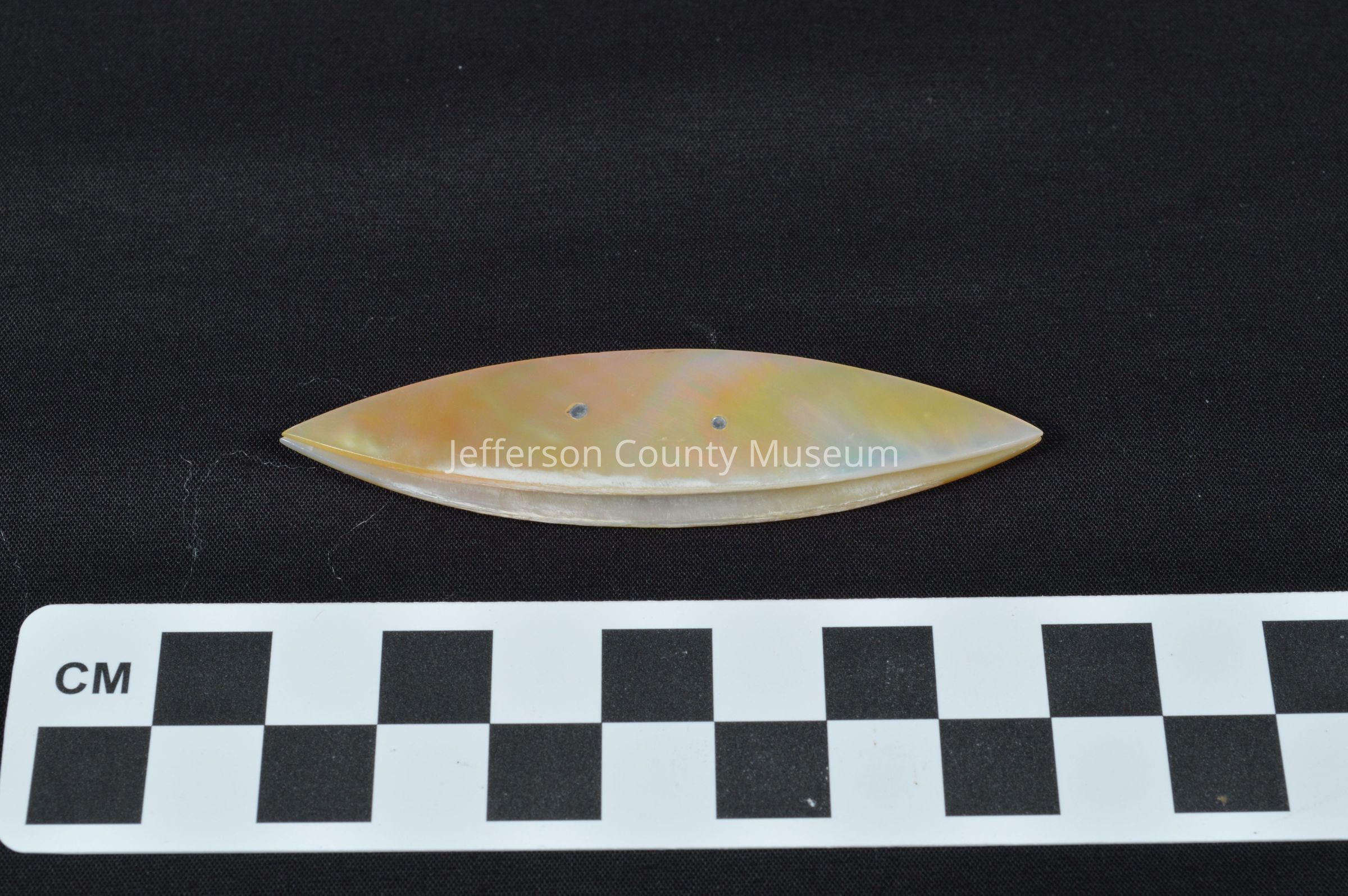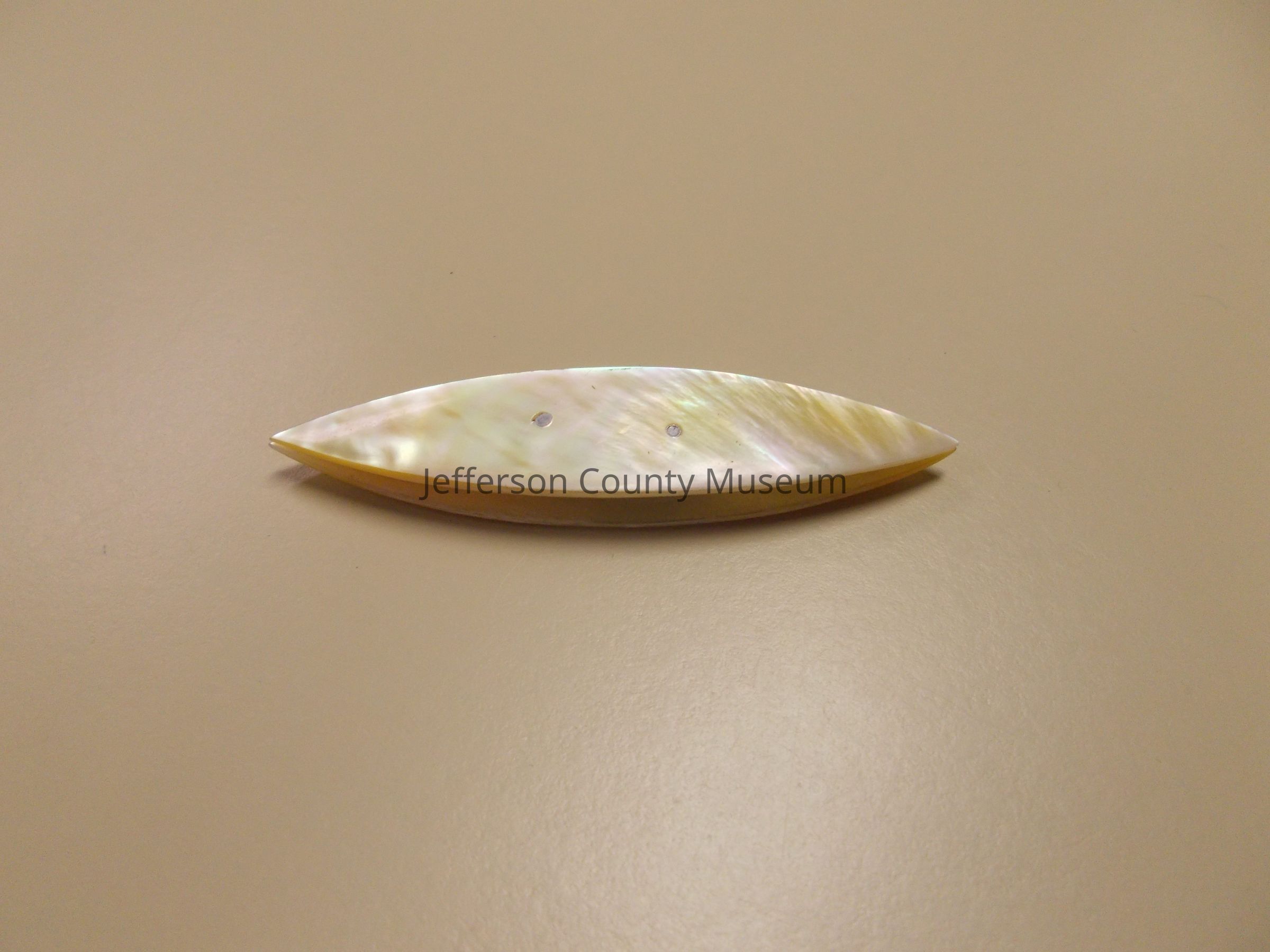 Mother of pearl tatting shuttle. Two metal pins connect the 2 sides through an oblong metal post in the center.