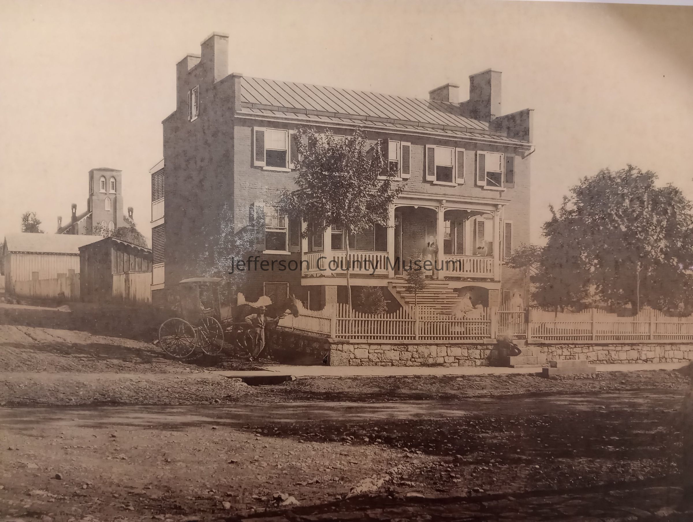 Reproduction photograph of the Hooff House in Charles Town, located on the southwest corner of Washington and present-day Church streets [in the 1880s at the time of this photograph it was East street]. At the time of the photograph the home was owned by James Lawrence Hooff and his wife Ann Amelia Beckham Hooff. Several family members stand and sit on the front steps of the home and in the yard, while another man stands at the side with a carriage. Zion Church is visible in the background without a steeple, along with several other buildings.Photograph Details