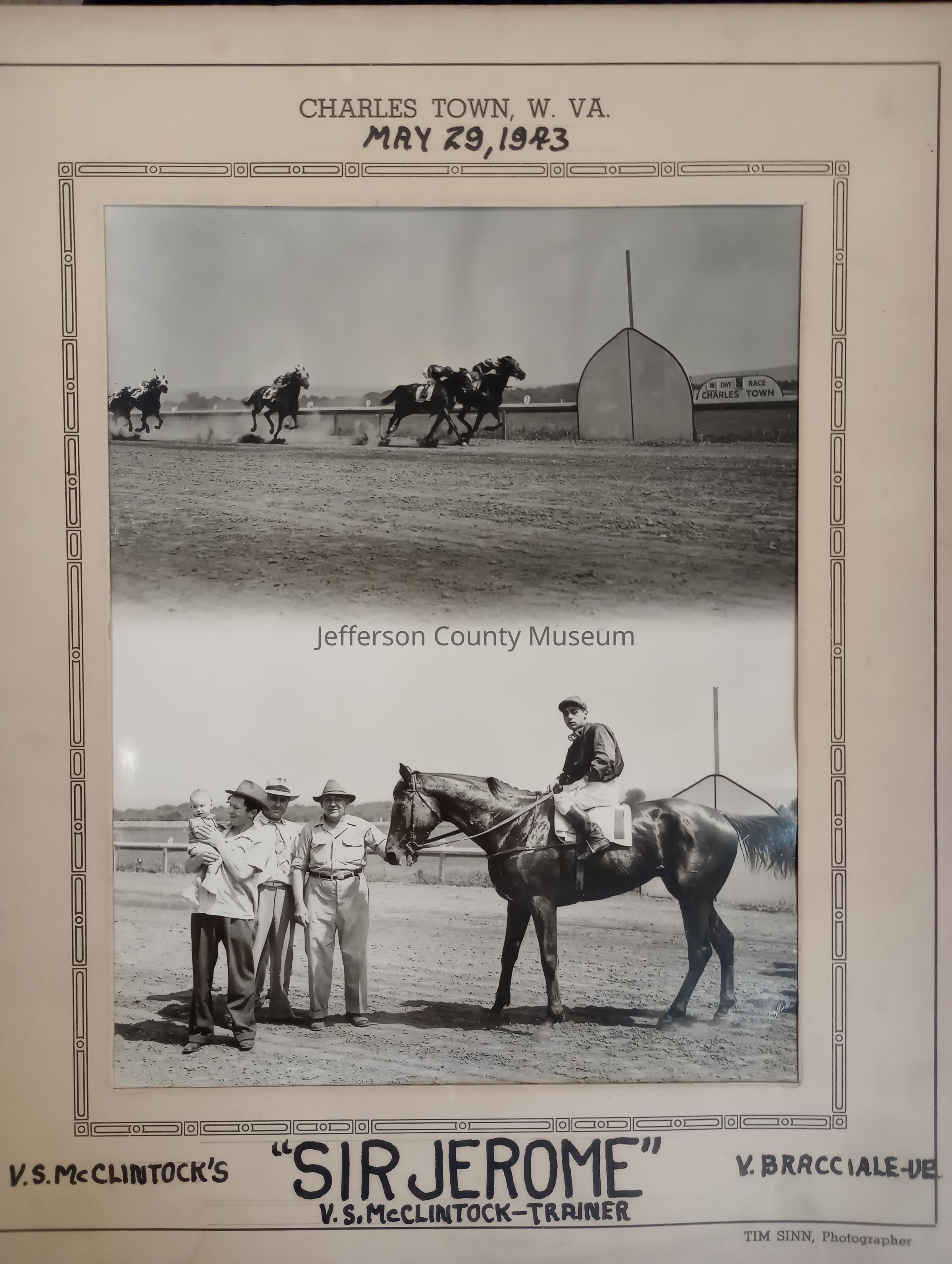Mounted black and white winners circle photo of "Sir Jerome" at Charles Town.Context