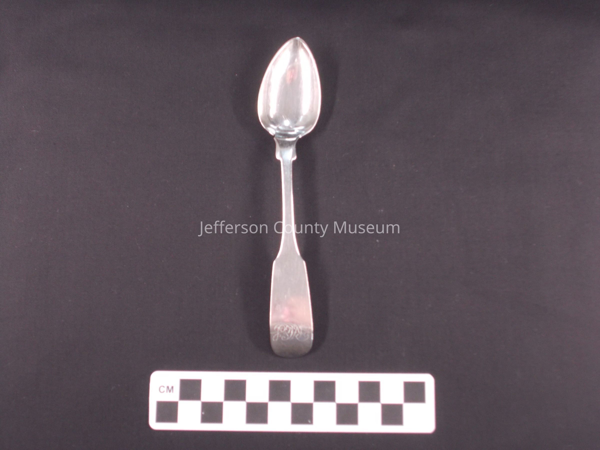 Coin silver teaspoon marked "YOUNG". On the handle is engraved "RAEL". Young refers to Samuel Young, Charles Town silversmith. From Charles Town, VA., circa 1811-1816. In set with object 214 (it is the smaller of the two).Acquisition