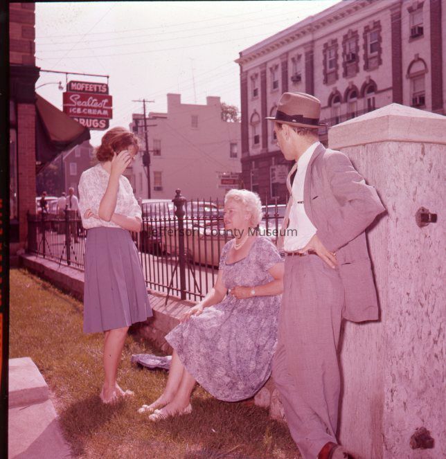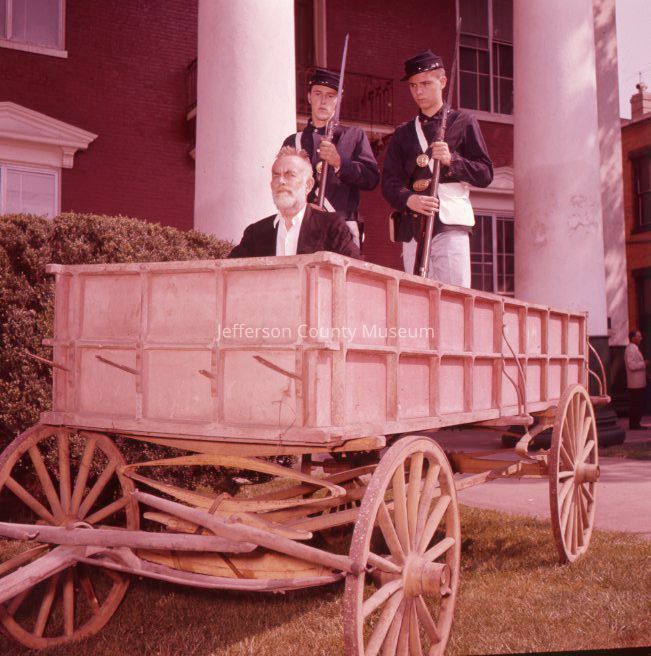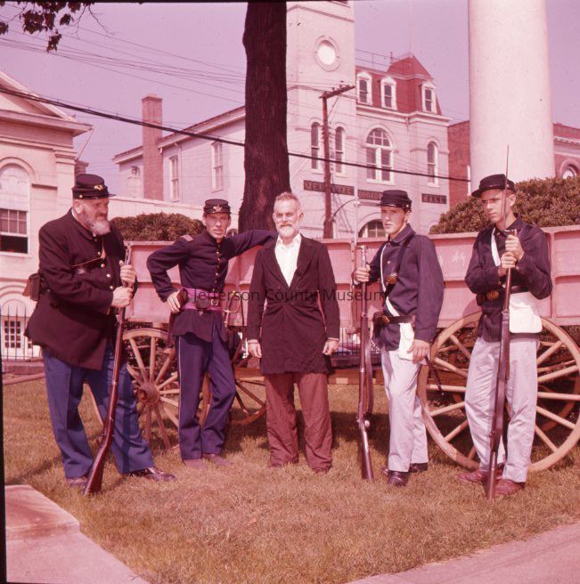John Brown play, The Anvil, characters, some in costume, in front of court house or with the John Brown wagon [5 out of 10 direct positives scanned]