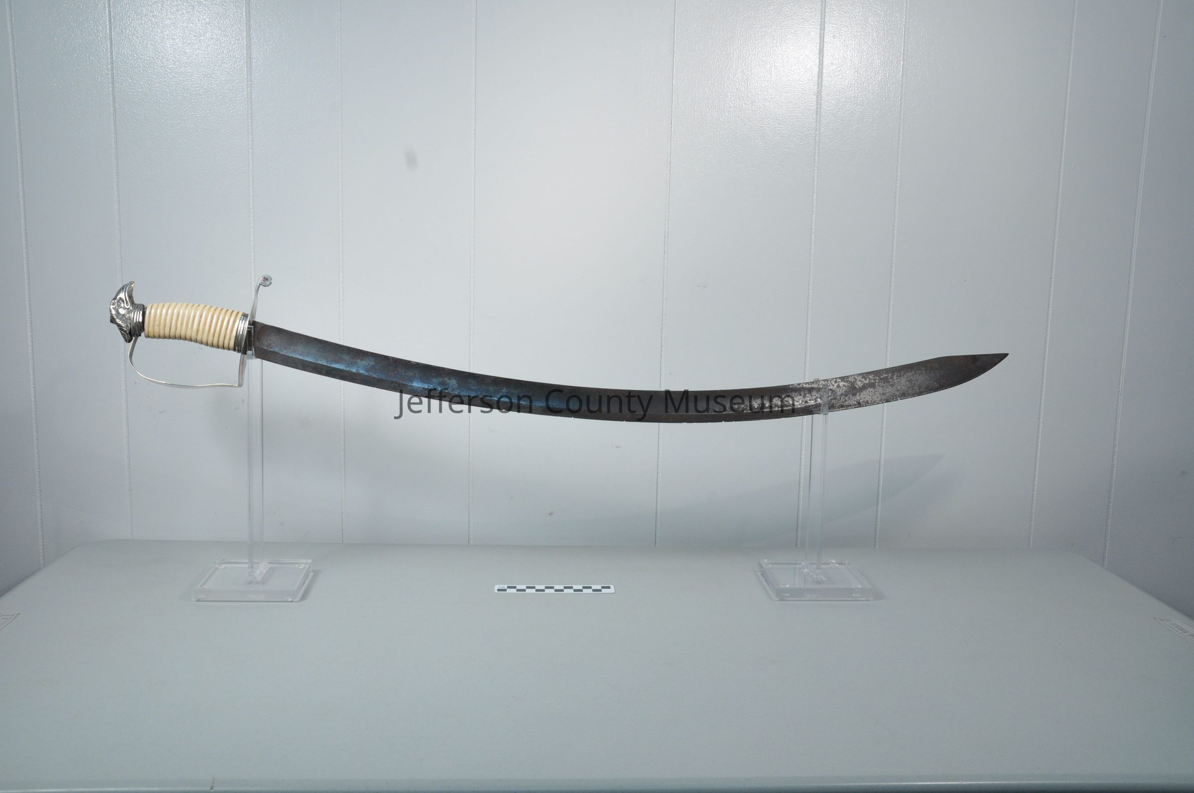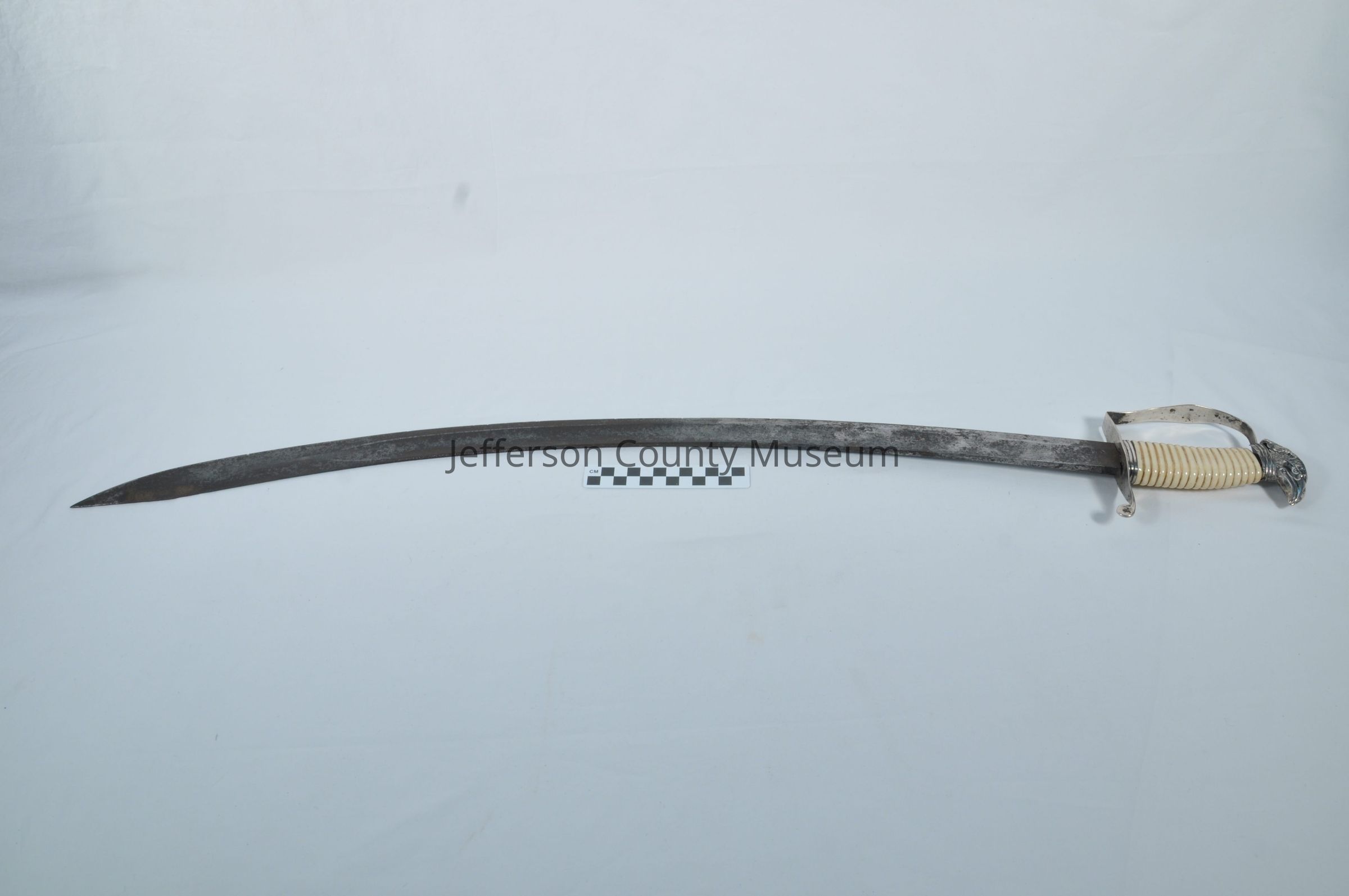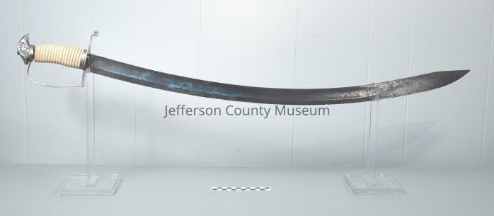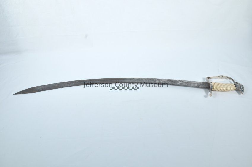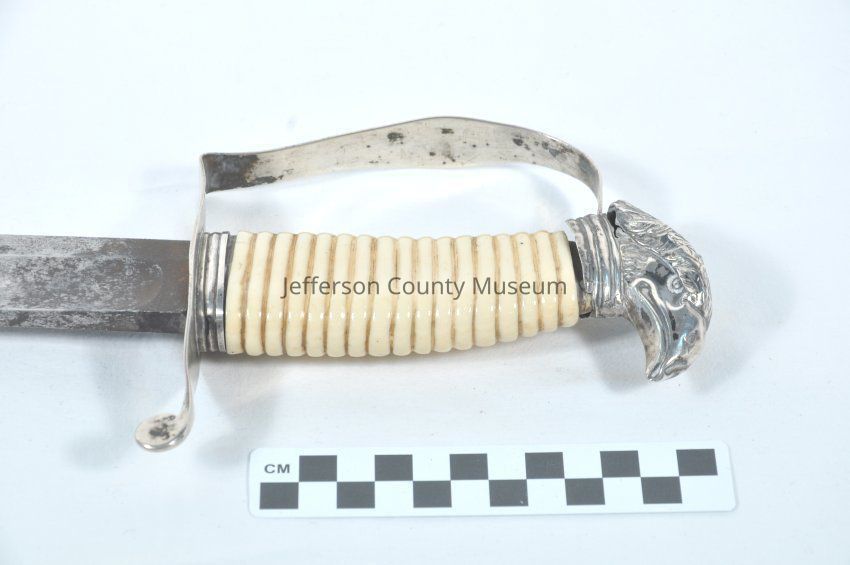 A silver dress sword with scabbard. Circa 1812. There is an eagle crest on top of the handle. It has a bone handle. The blade at the top is marked "WINNER" .Acquisition