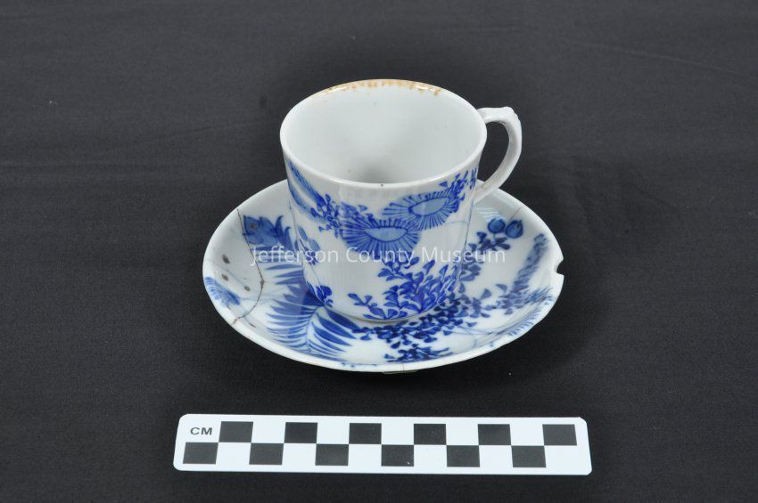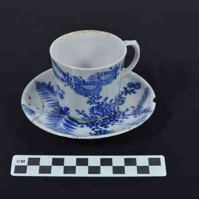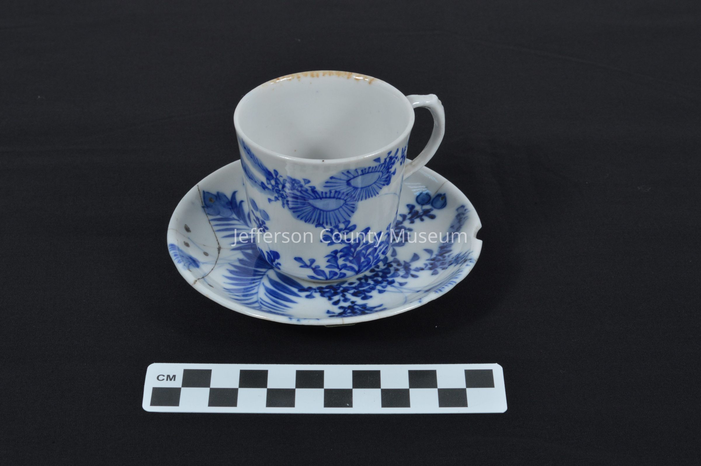 Blue flower and fern design on white china. Saucer has been stapled together. One large chip off rim.Acquisition