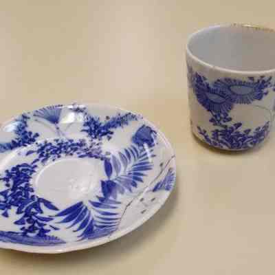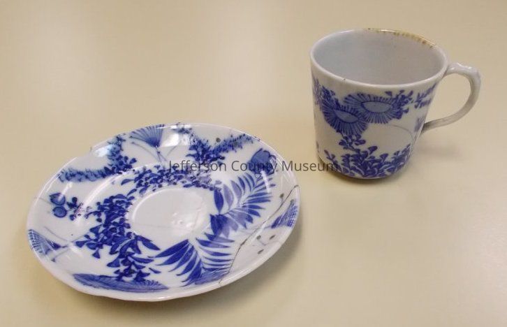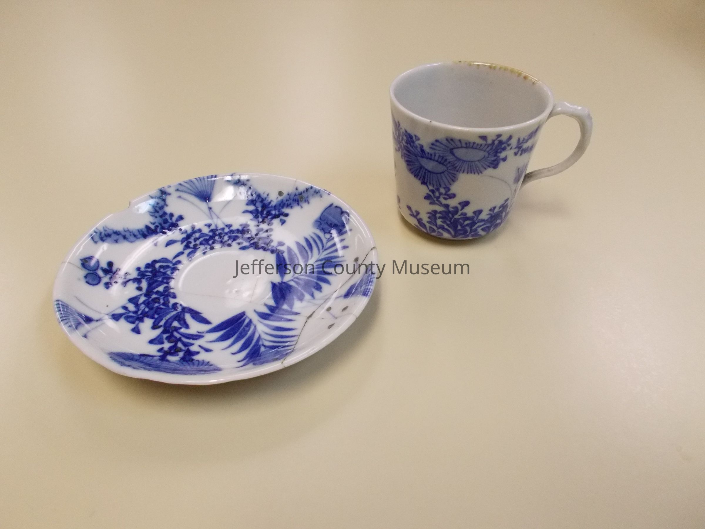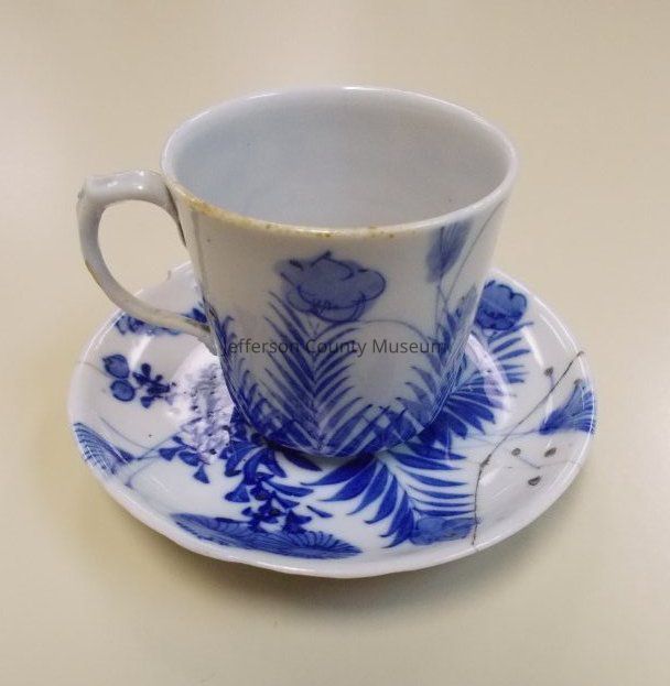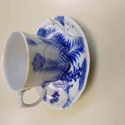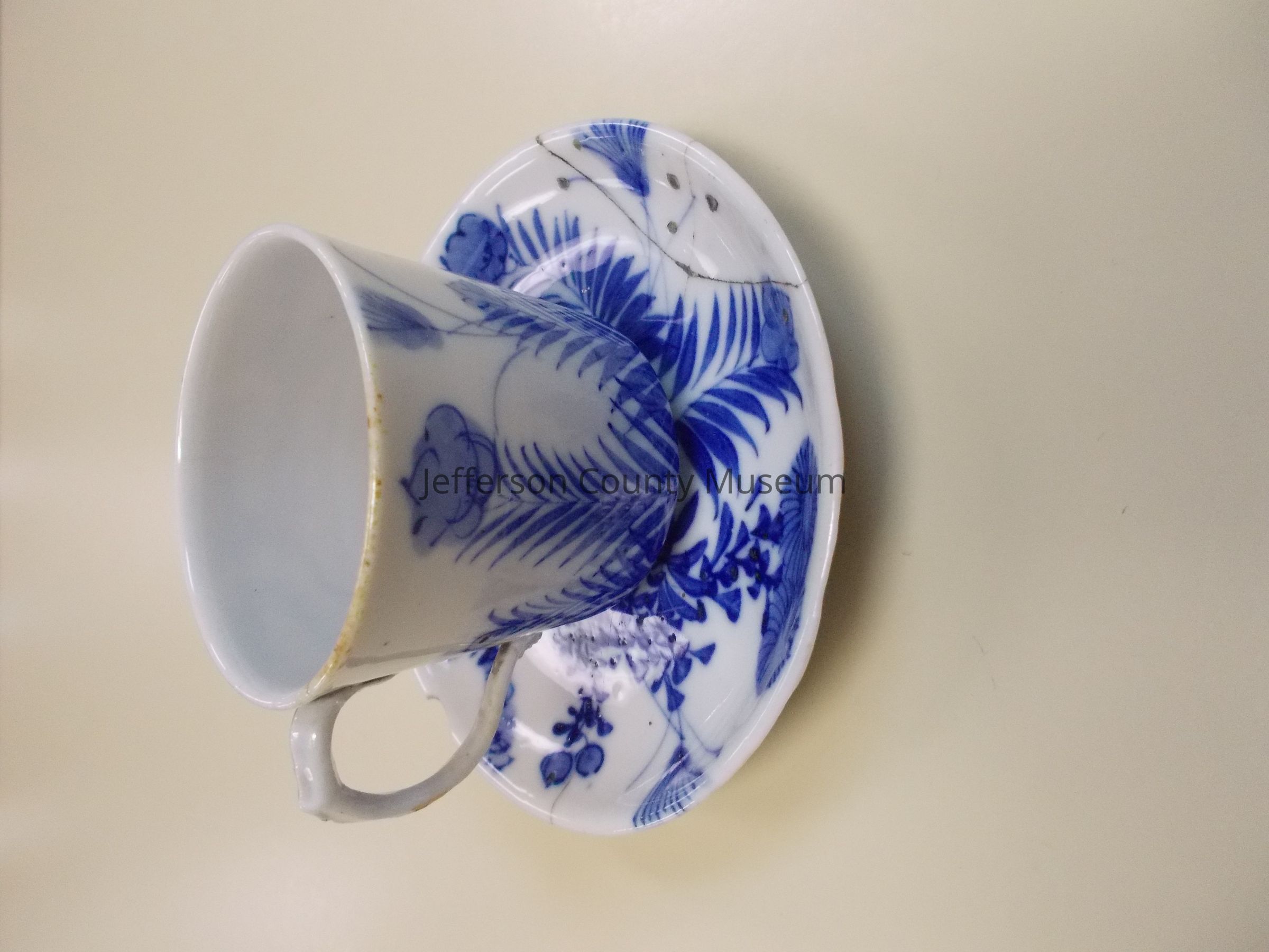 Used by Dolly Payne Todd Madison on her wedding day at Harewood. Blue flower and fern design on white china. Cup is narrow, slightly discolored on one side of rim and inside. The handle is uneven and discolored where it joins the cup.Acquisition