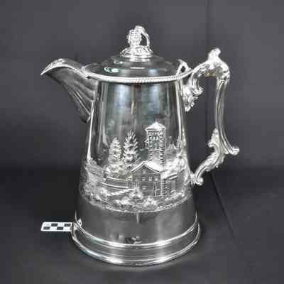 Silver water pitcher showing a house, tower, trees, and birds on one side, sailing ship on the other side. Hinged lid with grape cluster finial. Inscribed on the pitcher is "MERIDEN BRIT'A Co. DOUBLE WALL PITCHER LYMAN'S PATENT JUNE 8, 1858". A Spirit of Jefferson County clipping from February 8, 1933, to Mrs. Humphrey Keyes mentions(?) the pitcher. See also "When Tidewater Invaded the Valley". Also there is a letter (ARC675 K16) from the Richmond Grays to Mrs. Jane H. Keyes written on December 22, 1859, that accompanied the pitcher and goblets catalog numbers 127 and 128.Acquisition
