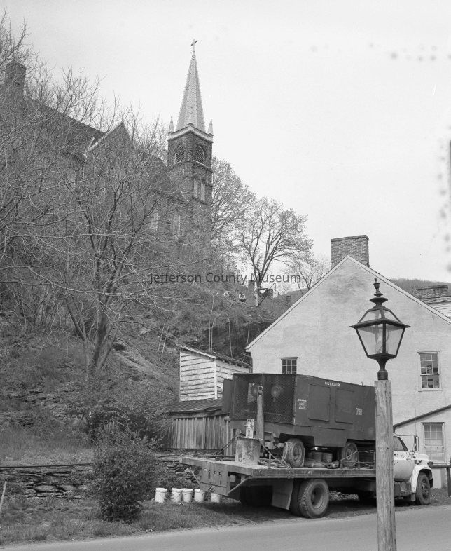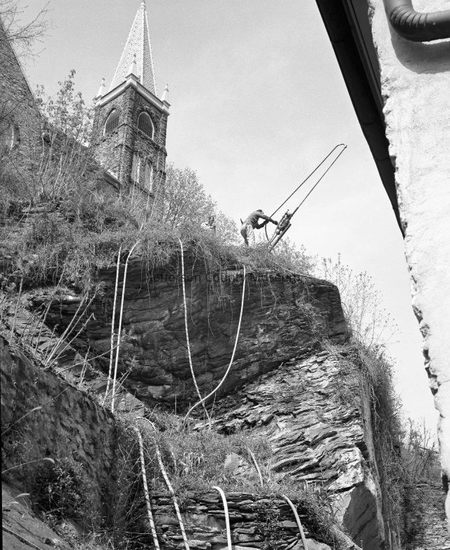 Drilling and pining rock behind Stage Coach Inn and near Catholic Church