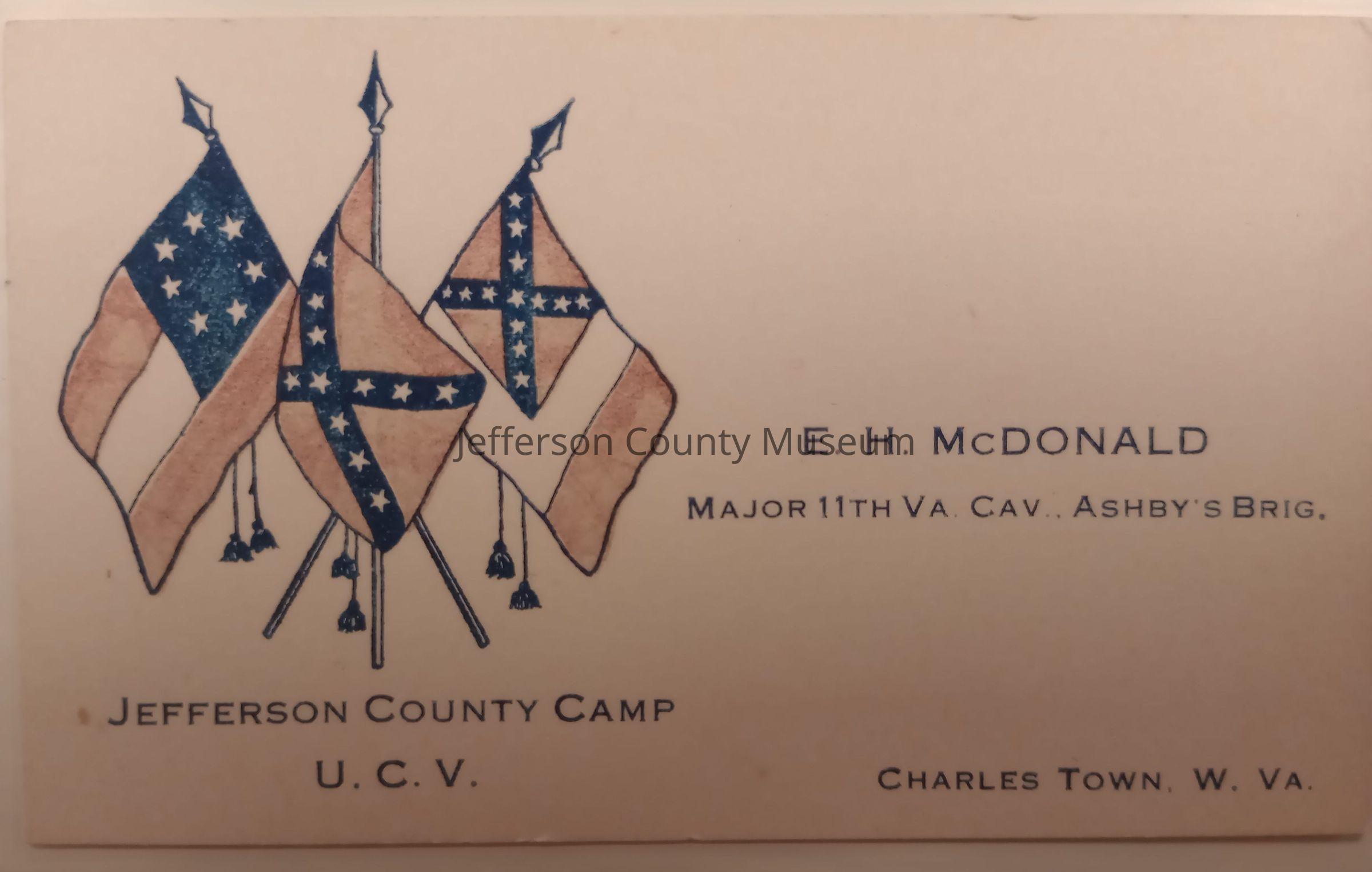 Card inscribed "E. H. McDONALD, MAJOR 11TH VA. CAV. ASHBY'S BRIG. Jefferson County Camp, U.C.V., Charles Town, W.Va." Three Confederate flags in color on left.Acquisition