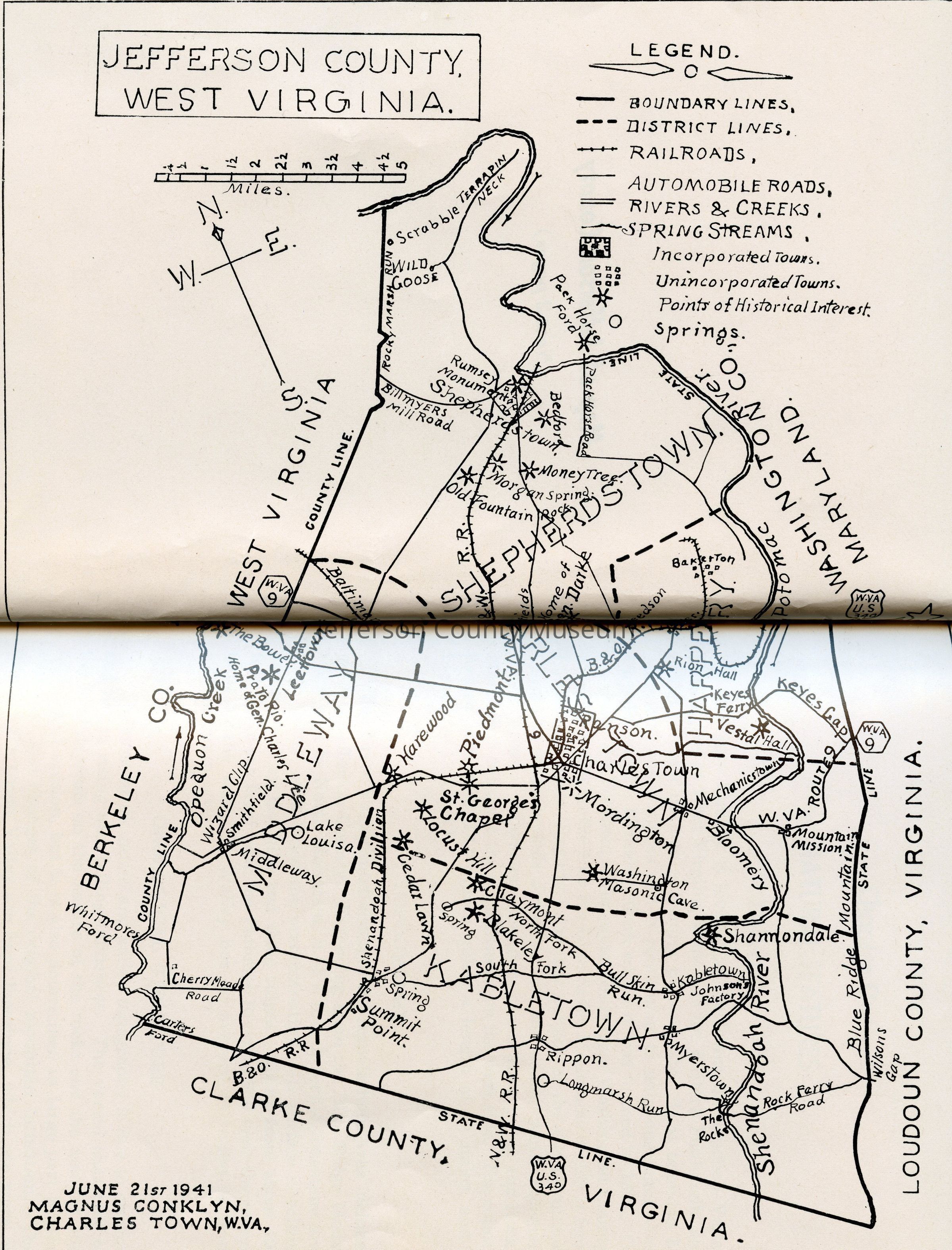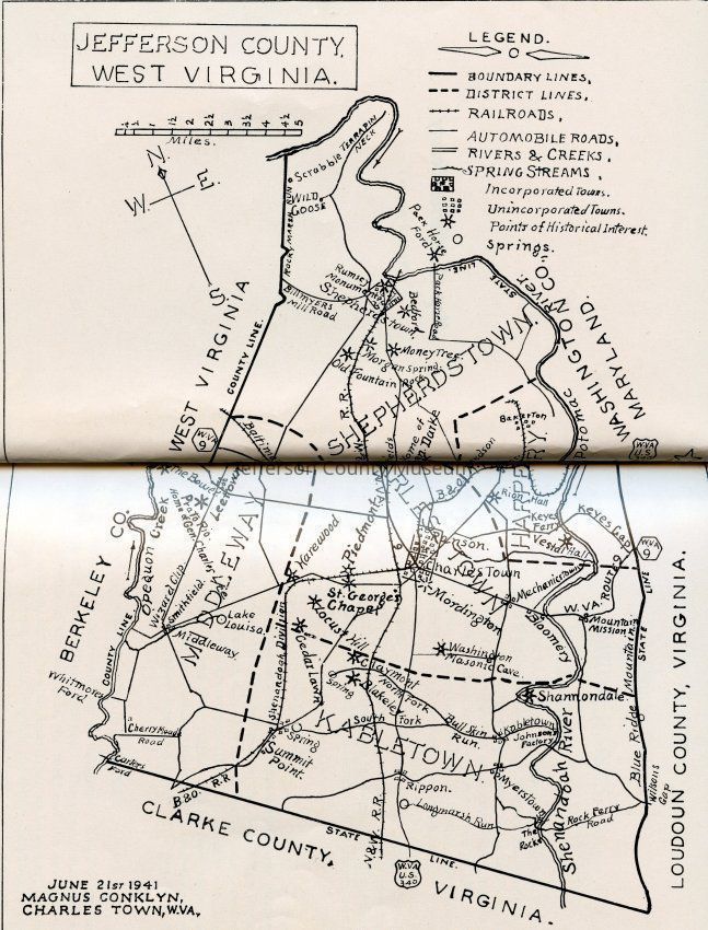 Historic Jefferson County contains a history of Jefferson County from the 17th century to the 20th century. Includes information about topography, early settlement, the American Revolution, James Rumsey, economic and cultural industry, the Jeffersonian Era, the Antebellum Era, John Brown, the Civil War, Reconstruction, World War I, and World War II.
