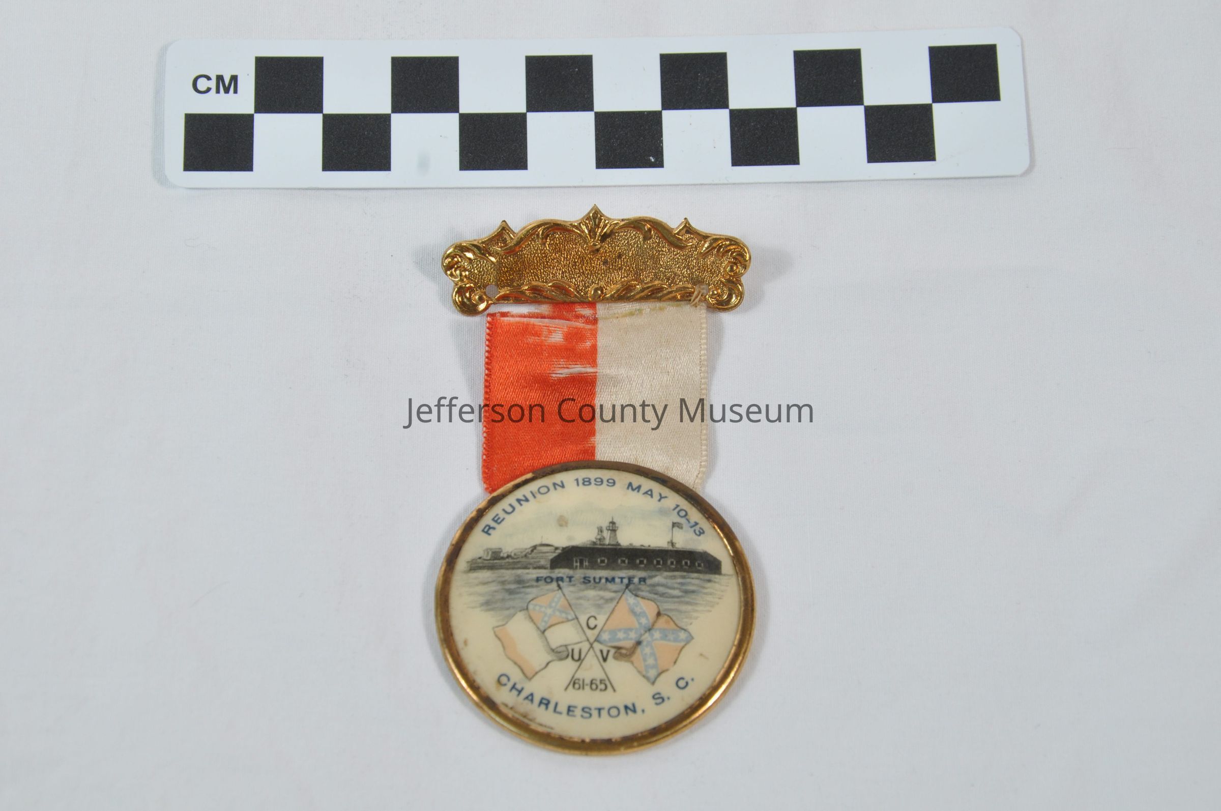 Reunion medal with red and white ribbon, a bar on top, a circular medal inscribed "REUNION 1899, MAY 10-13 CHARLESTON, S. C." Also a picture of Ft. Sumter and crossed Confederate flags with "UCV 61-65"Acquisition