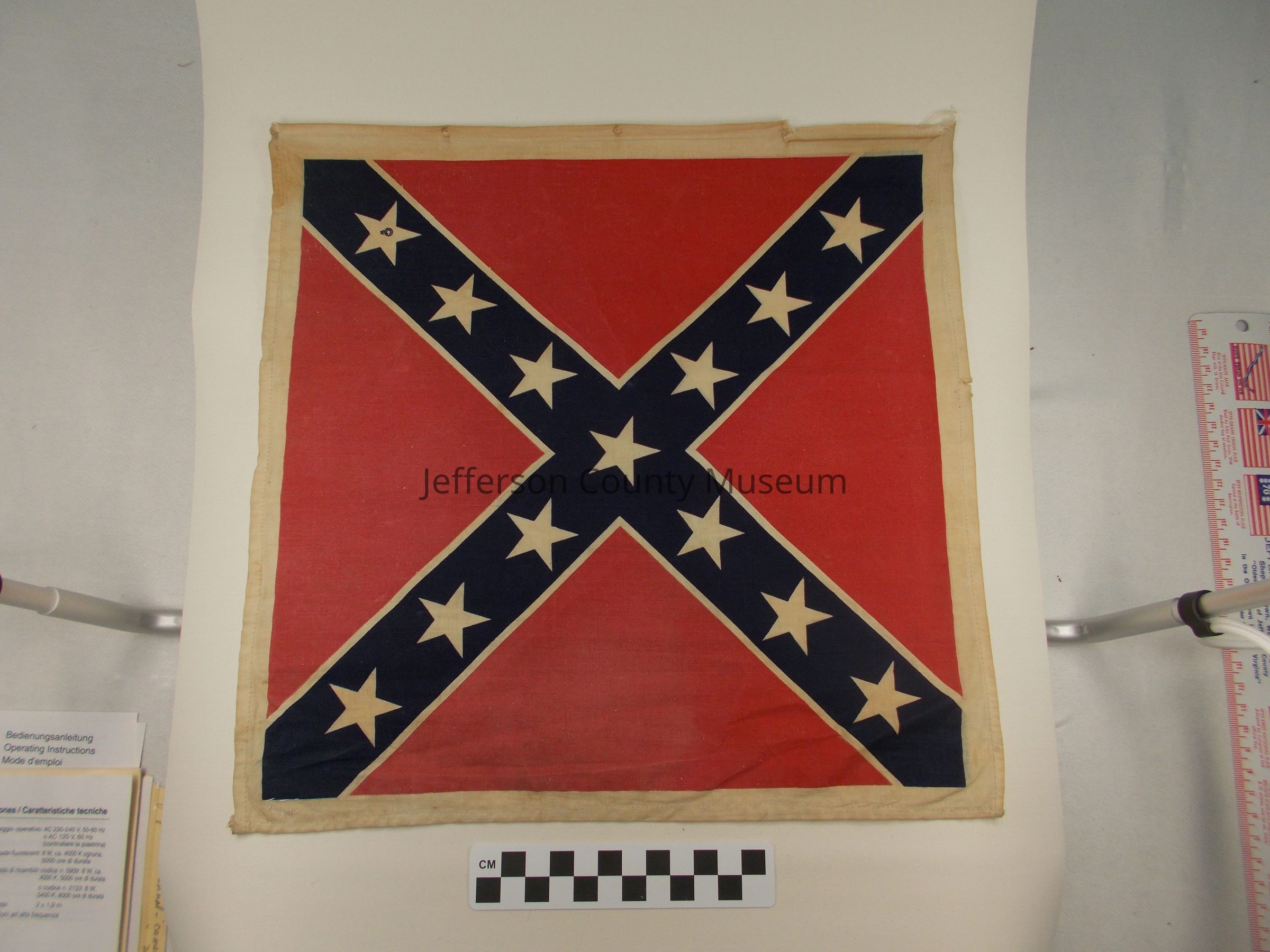 Small Confederate battle flag with crossed stars and bars, 13 stars in blue stripes on red field.Acquisition