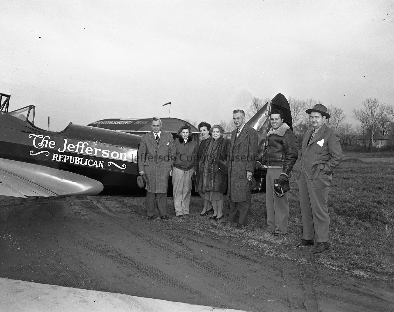 Left to right: R. J. Funkhouser, Mrs. Darwin Hennessey, unknown Mrs. Funkhouser, Darwin Hennessey, pilot and Bill Grove