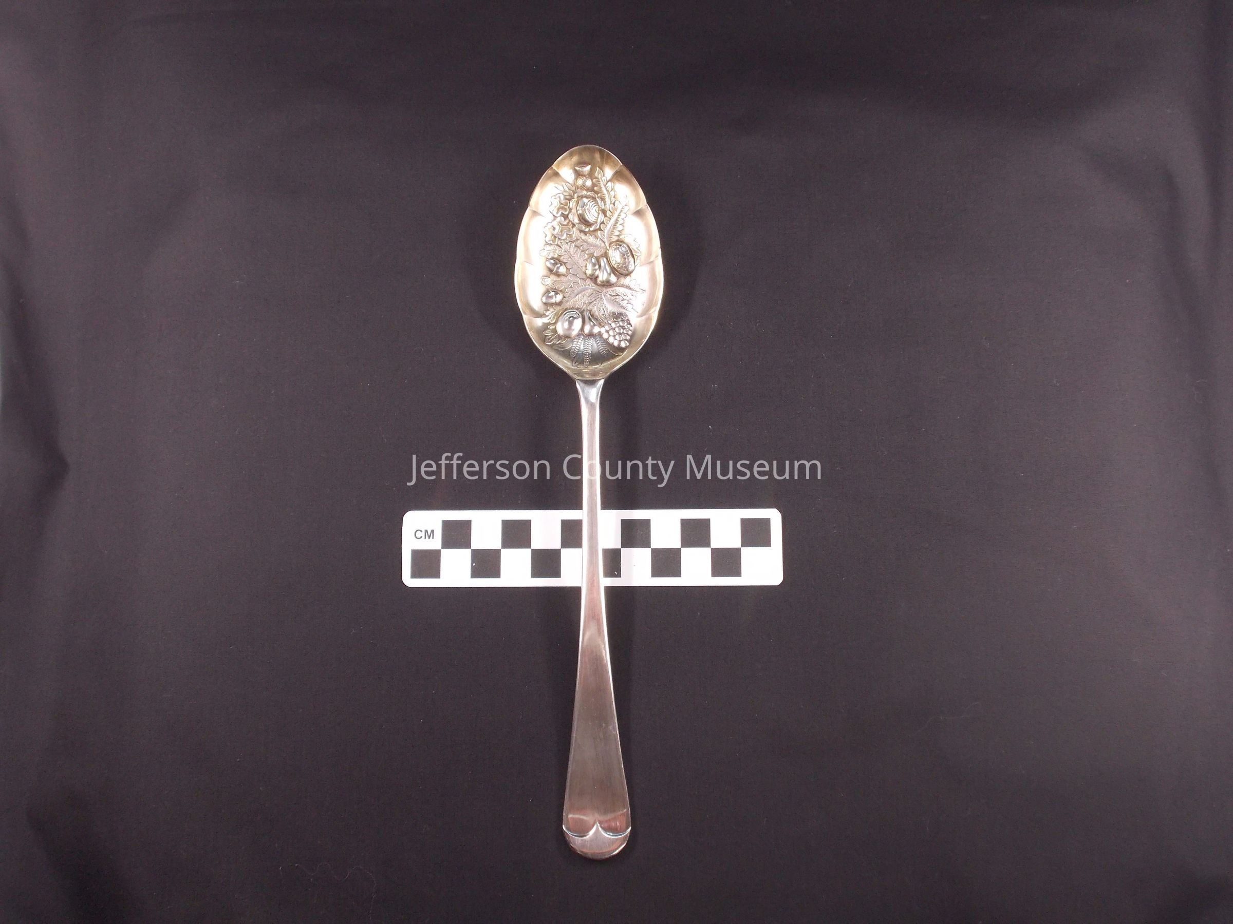 Silver serving spoon for fruit. Embossed design of leaves, rose, thistle shamrocks, grapes and acorns. Marked "EPNS, SHEFFIELD, ENGLAND" on back. Traces of gilt on bowl.Acquisition