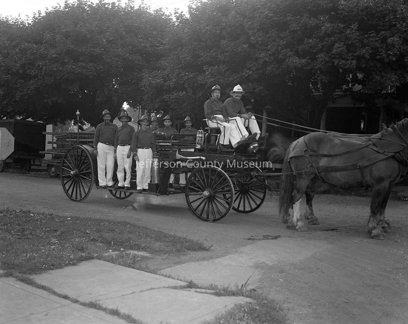 Opportunity Day Parade and 1949 bond drive - night parade with old horse drawn hook and ladder wagon