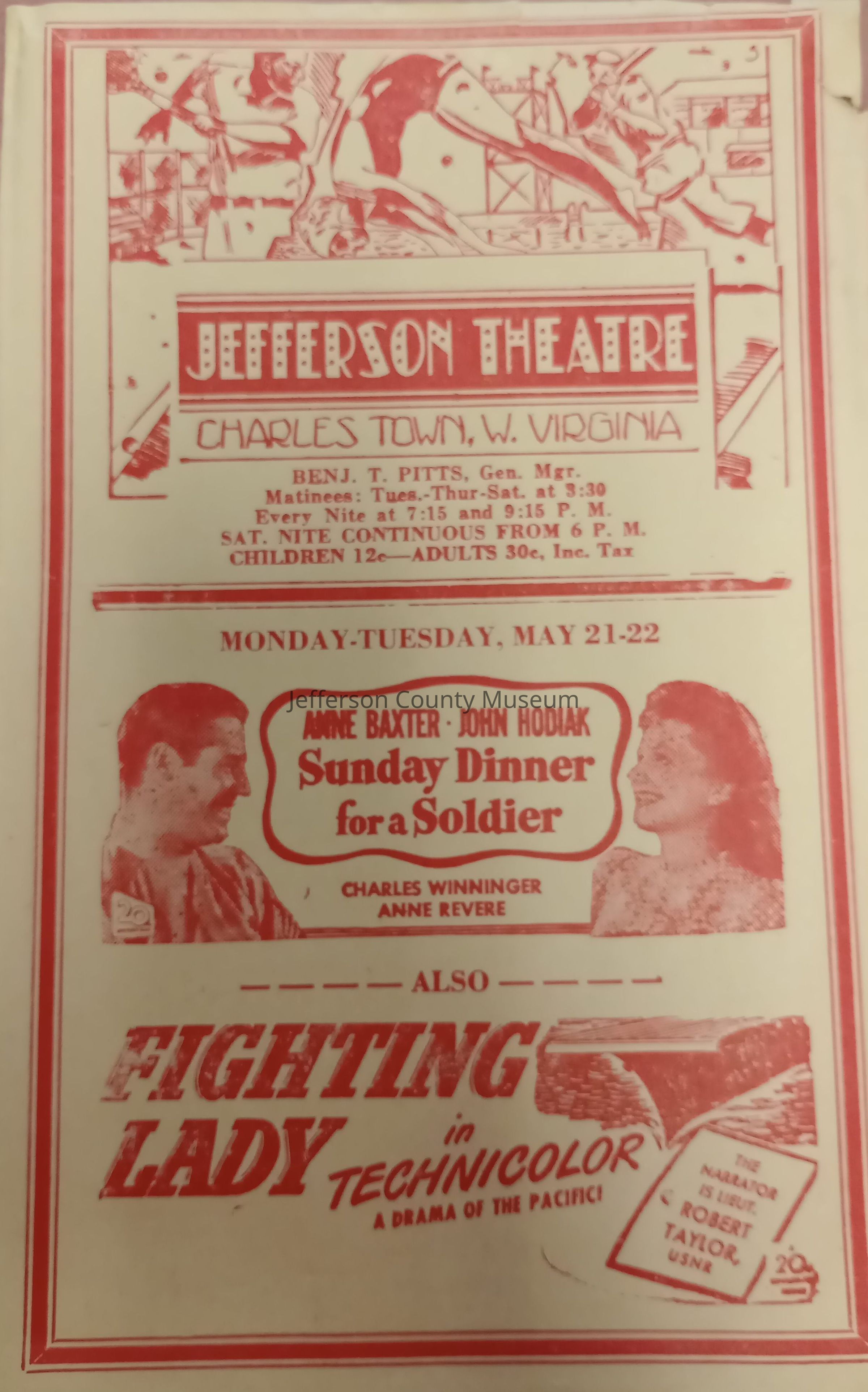 Program printed in red ink featuring upcoming films at the Jefferson Theatre in Charles Town. Films from 1944-1945 include "Sunday Dinner for a Soldier," "Fighting Lady," "Tampico," "She Gets Her Man," and "Bordertown Trails."Acquisition