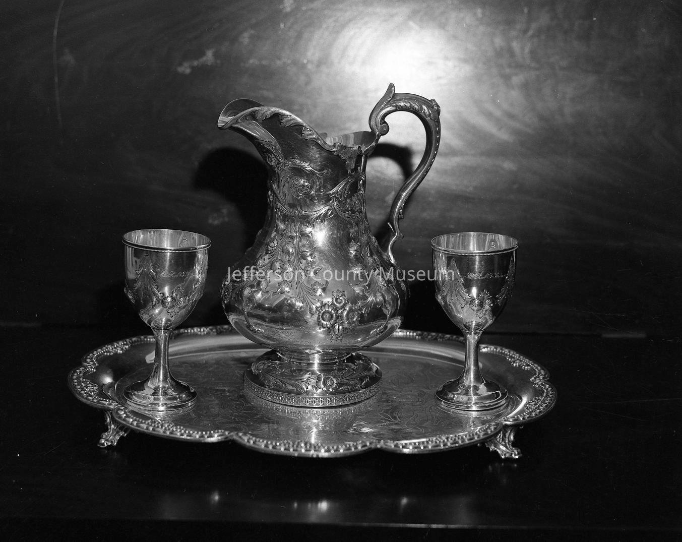 Miss Lucy Ambler's silver service. A gift to her aunt, Mrs. Robert T. Brown, from the Petersburg Grays and the Petersburg City Guards, December 21, 1859. Silver pitcher, tray and goblets.