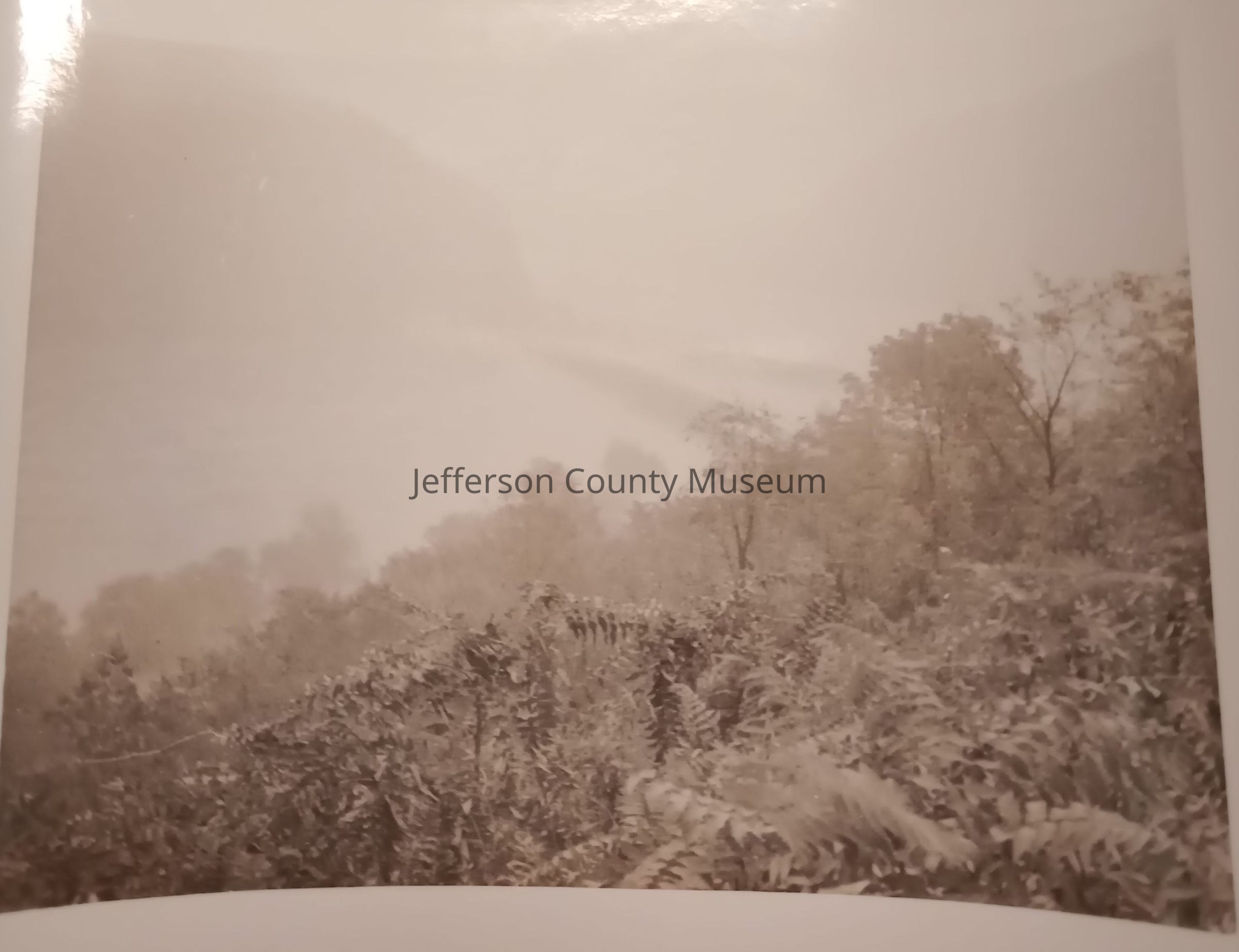 Black and white photo taken from above showing the flooded confluence of the Shenandoah and Potomac bridges at Harpers Ferry in 1942. Railroad bridges can be seen covered in water, trees and vegetation are in the foreground.Photograph Details