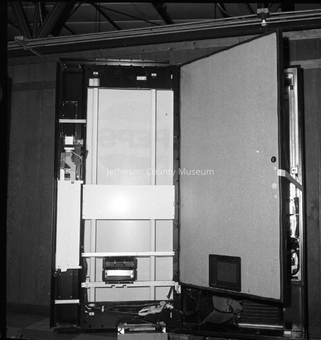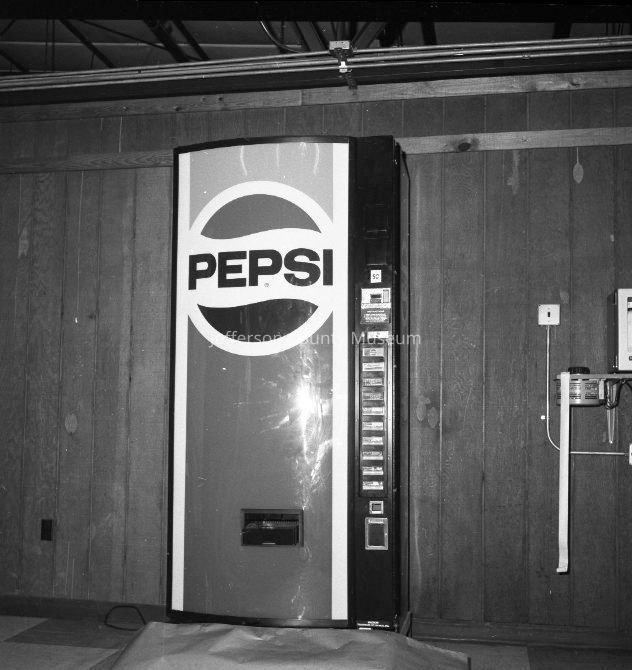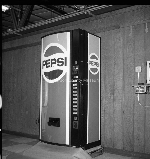 Dixie Narco for U.L. - Pepsi machine showing bow front style of illuminated Pepsi sign [3 out of 6 negatives scanned]