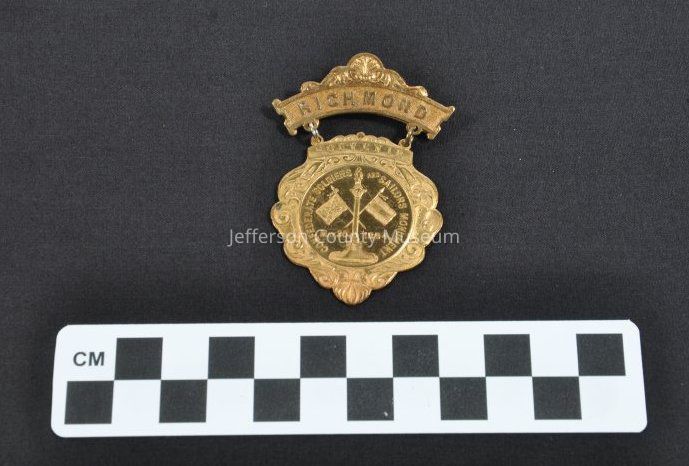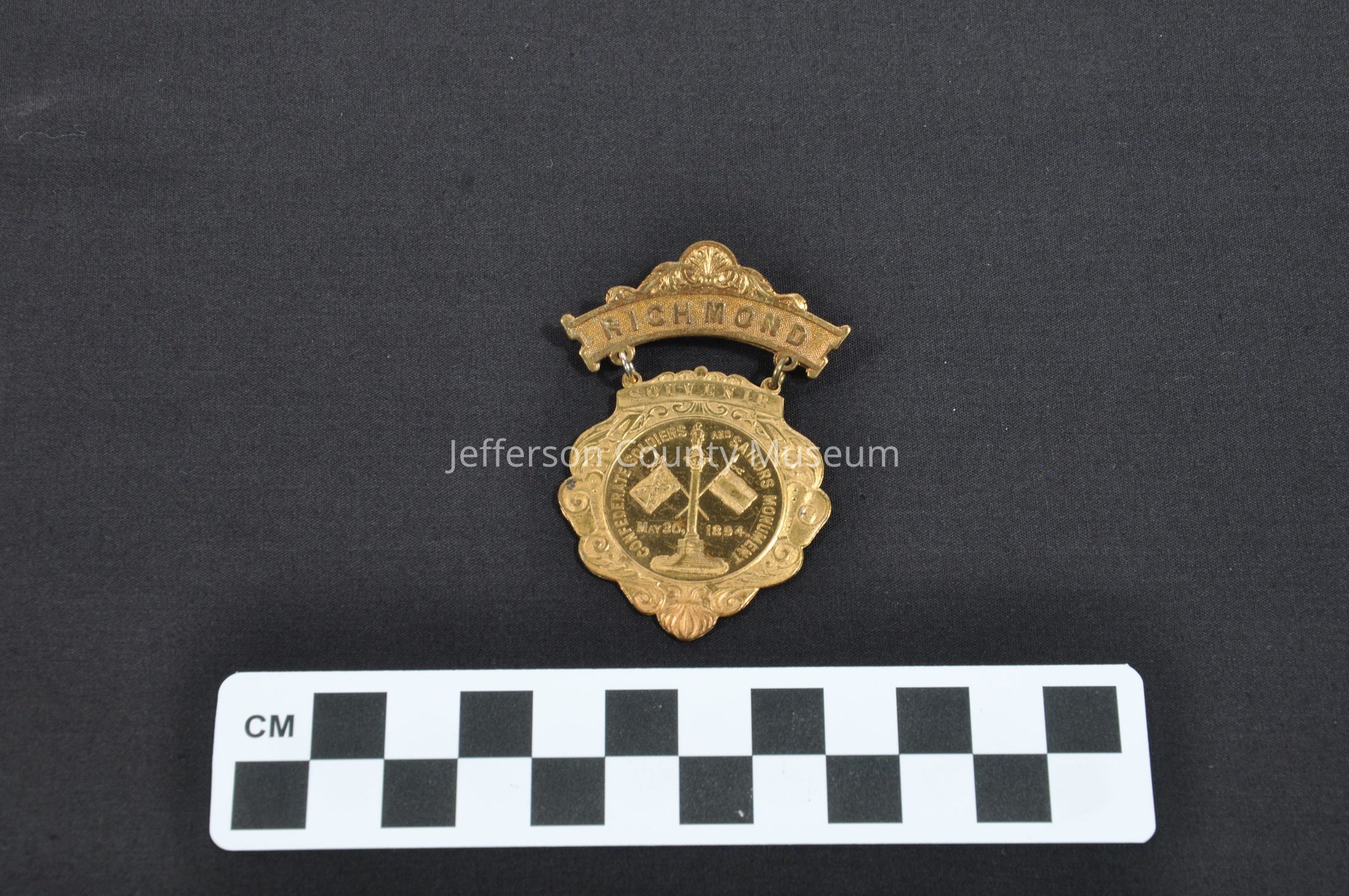Two part medal "RICHMOND" at top. Bottom nearly round part says "SOUVENIR CONFEDERATE SOLDIERS AND SAILORS MONUMENT MAY 30, 1894". Has shaft monument with soldier on top with Confederate flags on either side.Acquisition