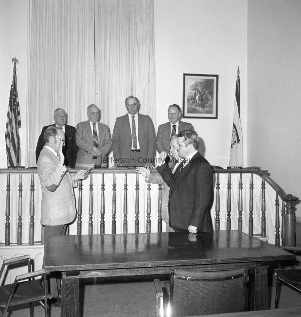 County Commission - John Ott, Kelly Lance, Doris Whiting, Henry Morrow being sworn in by Garland Moore to offices of County Commission and Clerks of Circuit Court and County Court