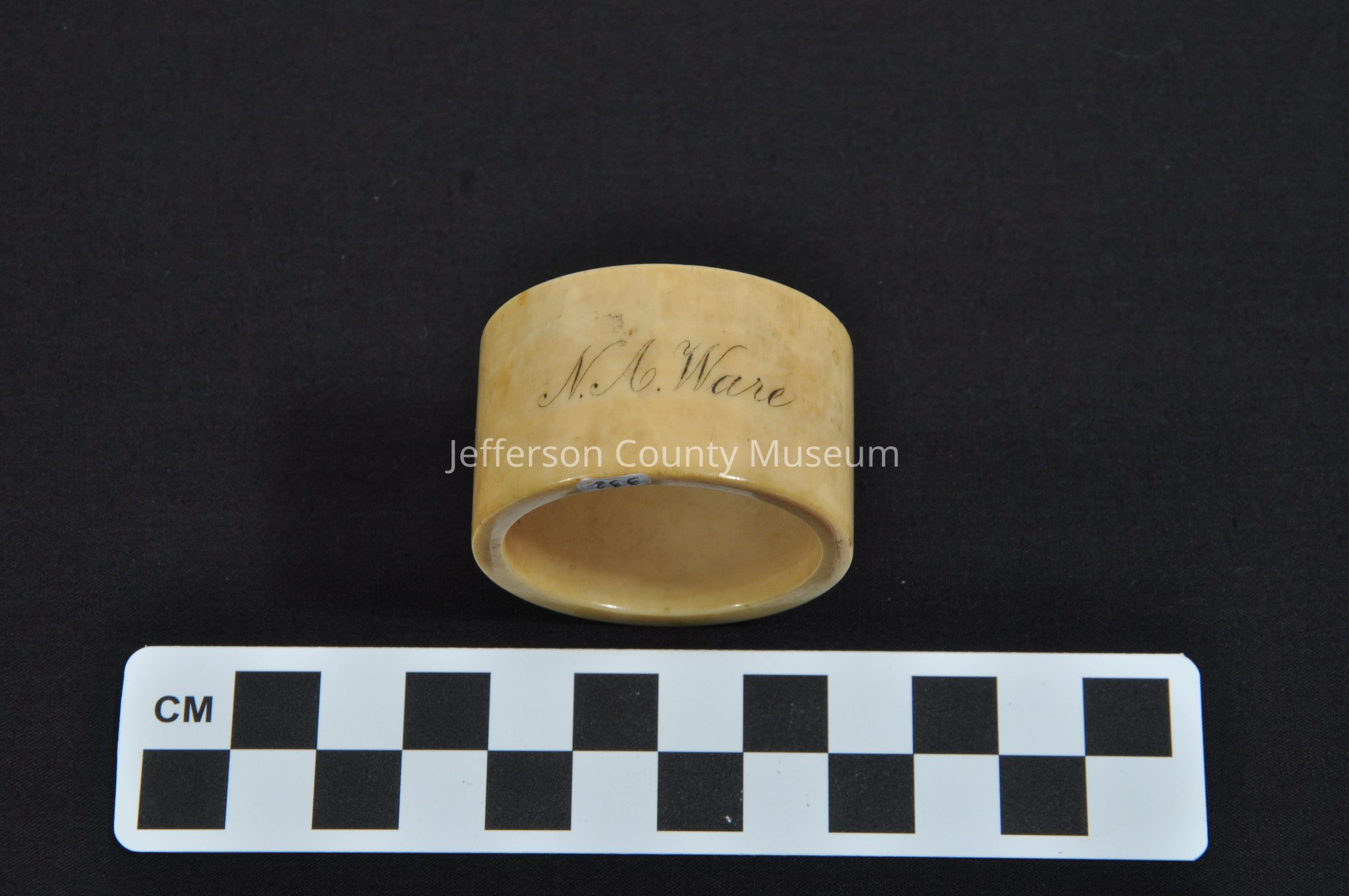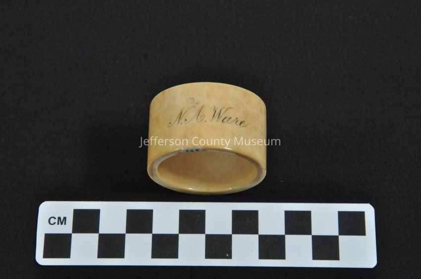 Ivory napkin ring. Has "N. A. Ware" inscribed on it in black.