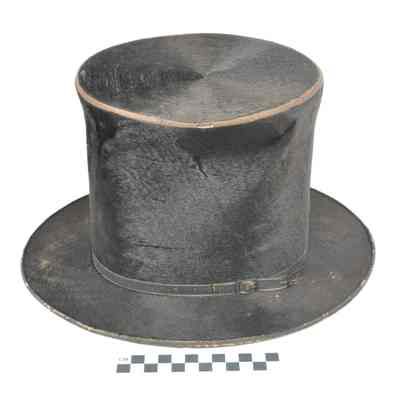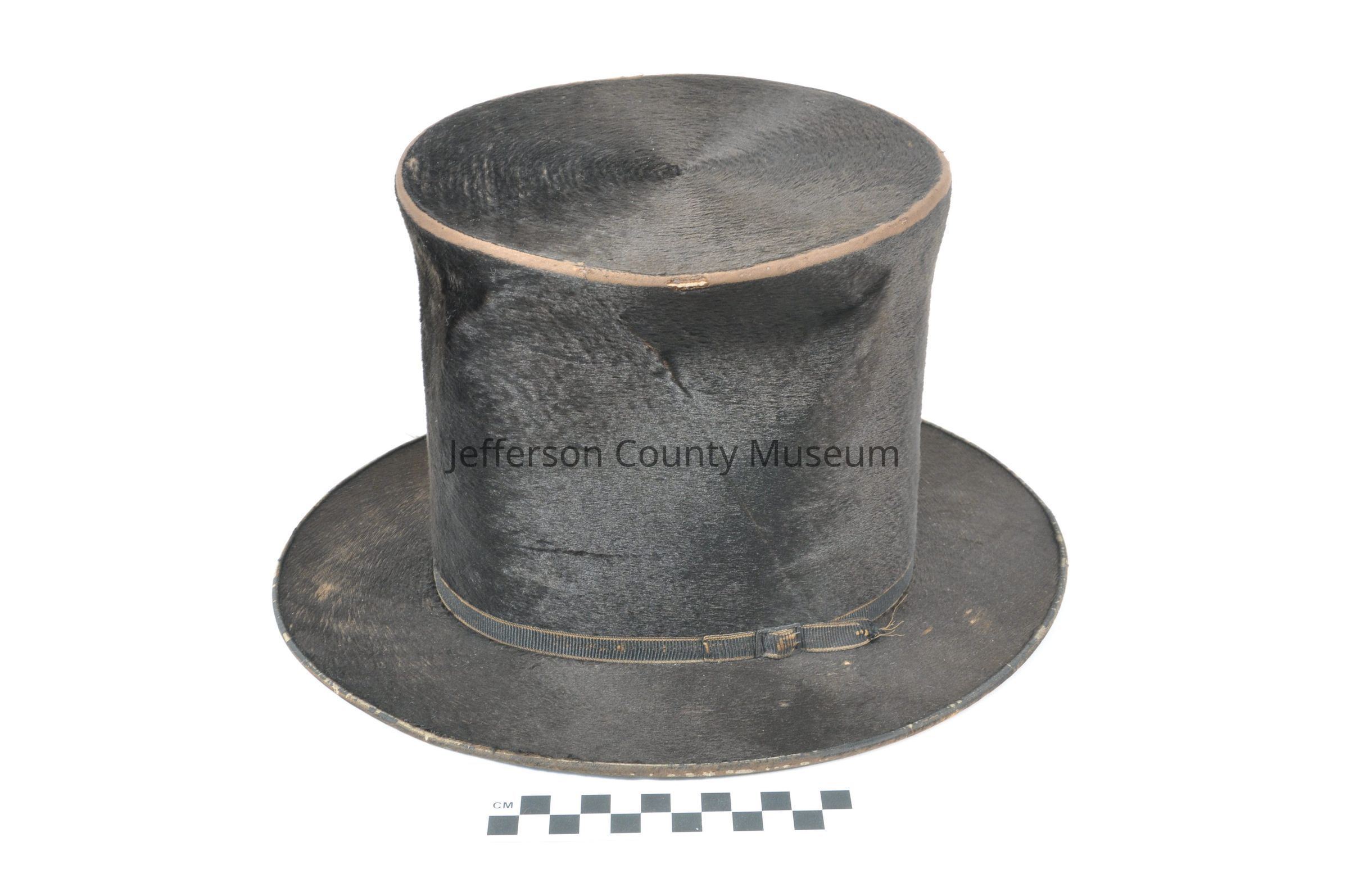 Dark brown beaver top hat. Label under crown. Eagle perching on shield with design of leaves and flowers above the words "J. S. JACKSON, WINCHESTER, VA." Wide leather sweat band. Blue and green paper lines the inside.Acquisition