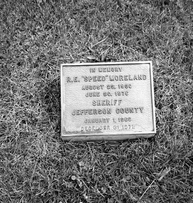 Plaque reads: "R. E. "Speed" Moreland, August 23, 1930, June 30, 1976, Sheriff, Jefferson County, January 1, 1969, December 31, 1972"