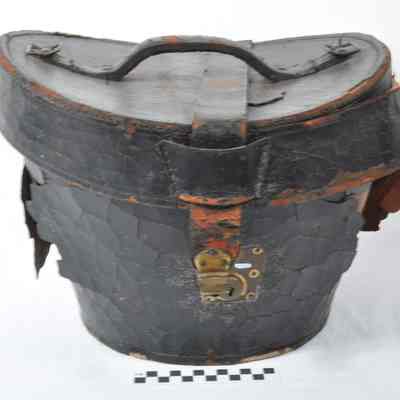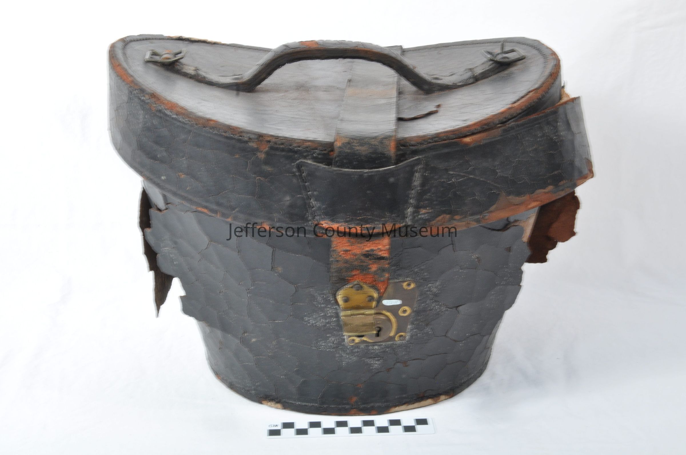Leather case lined with blue silk. Elastic straps inside to hold hat in place.