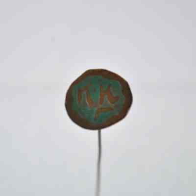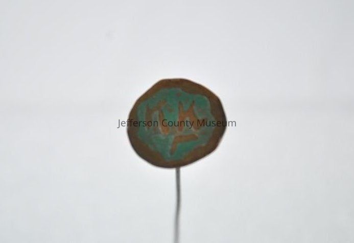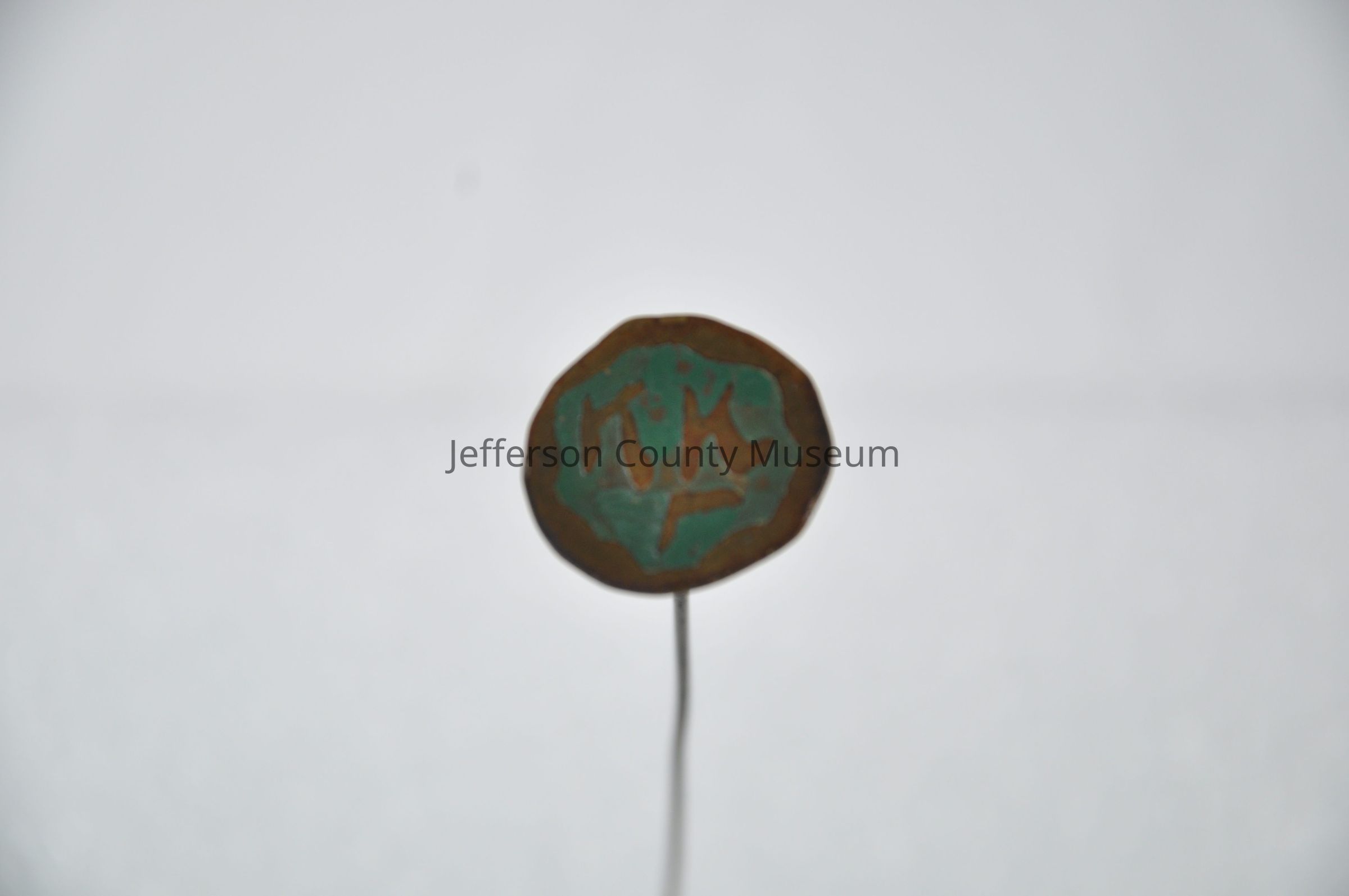 Brass hatpin. Flat round head with raised markings, possibly Chinese characters surrounded by green color.Acquisition