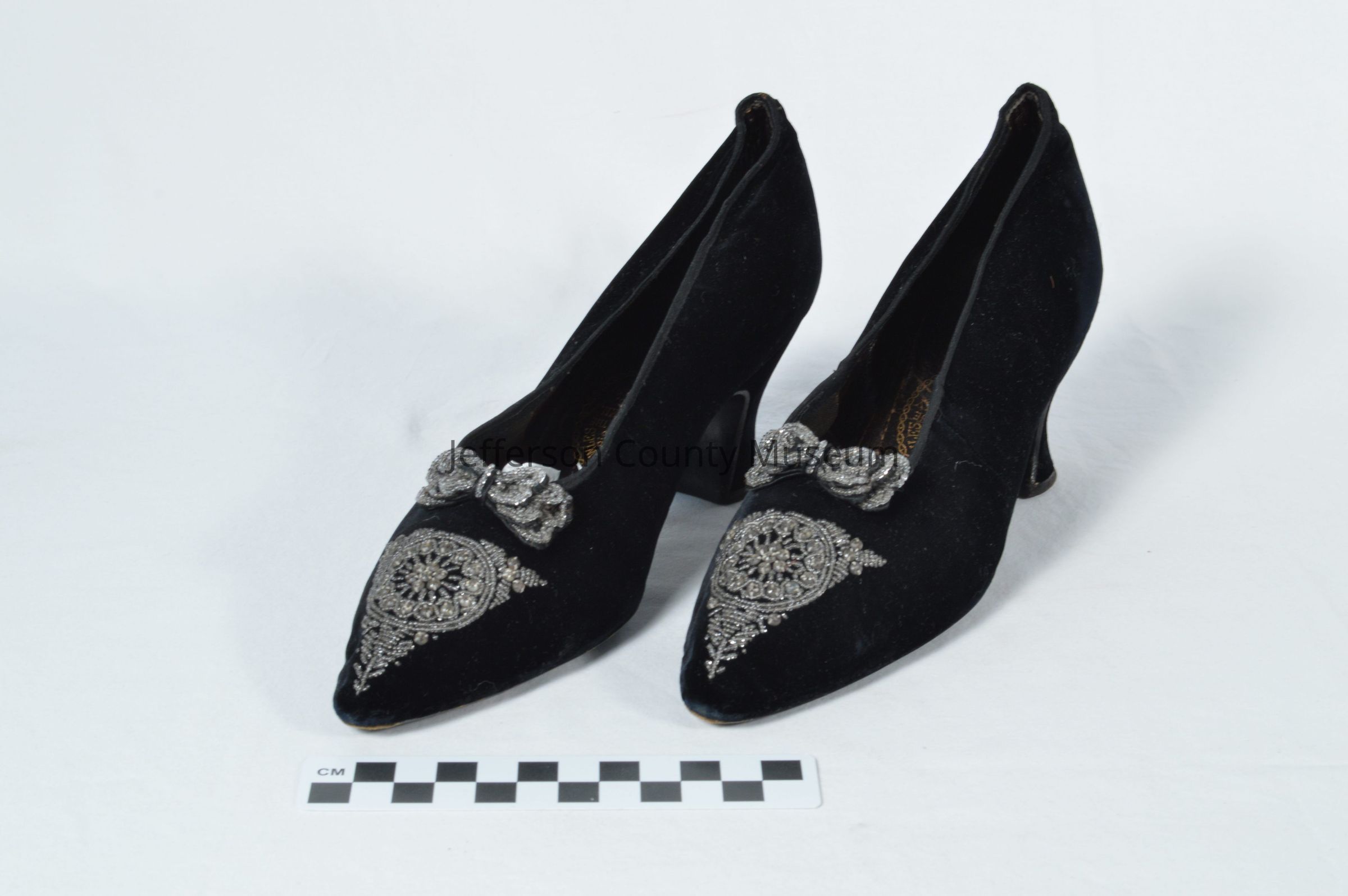 Wedding shoes of black satin. Pointed toes, half-moon-shaped heels, tiered bow on instep. Toes and bow are beaded with clear beads. Label embossed in instep "HOOK KNOWLES & CO LD. MAKERS TO THE ROYAL FAMILY 66 & 65. NEW BOND ST. LONDON" 341a is right shoe. 341b is left shoe.Acquisition