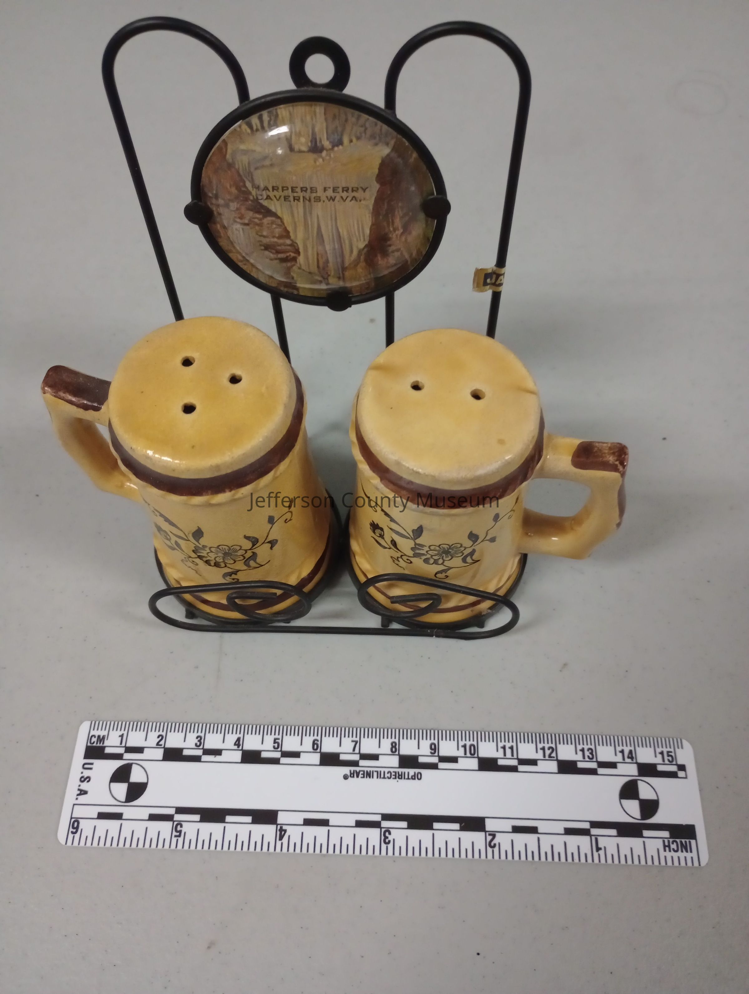 Metal stand with a medallion reading "Harpers Ferry Caverns" (2025.022.002a) with a yellow flowered pepper shaker (2025.022.002b) and salt shaker (2025.022.002c). Pepper shaker is missing the stopper at the bottom. A sticker on Japan indicates the souvenir was made in Japan.Acquisition