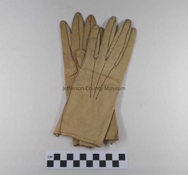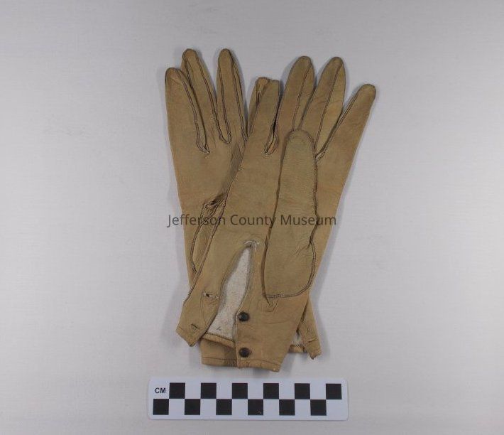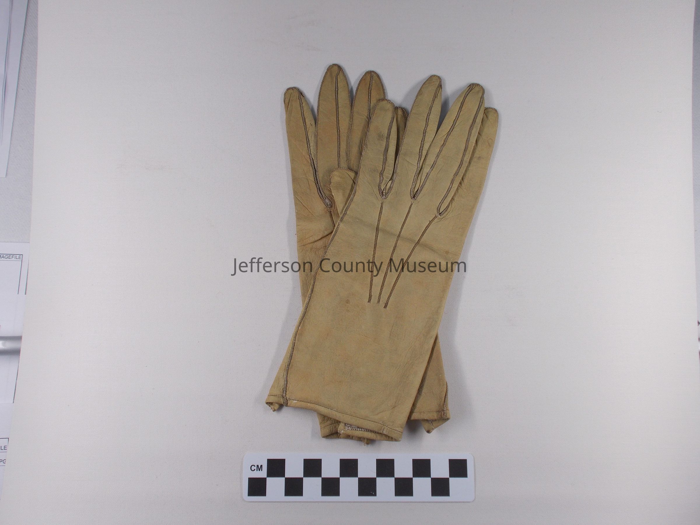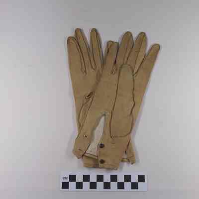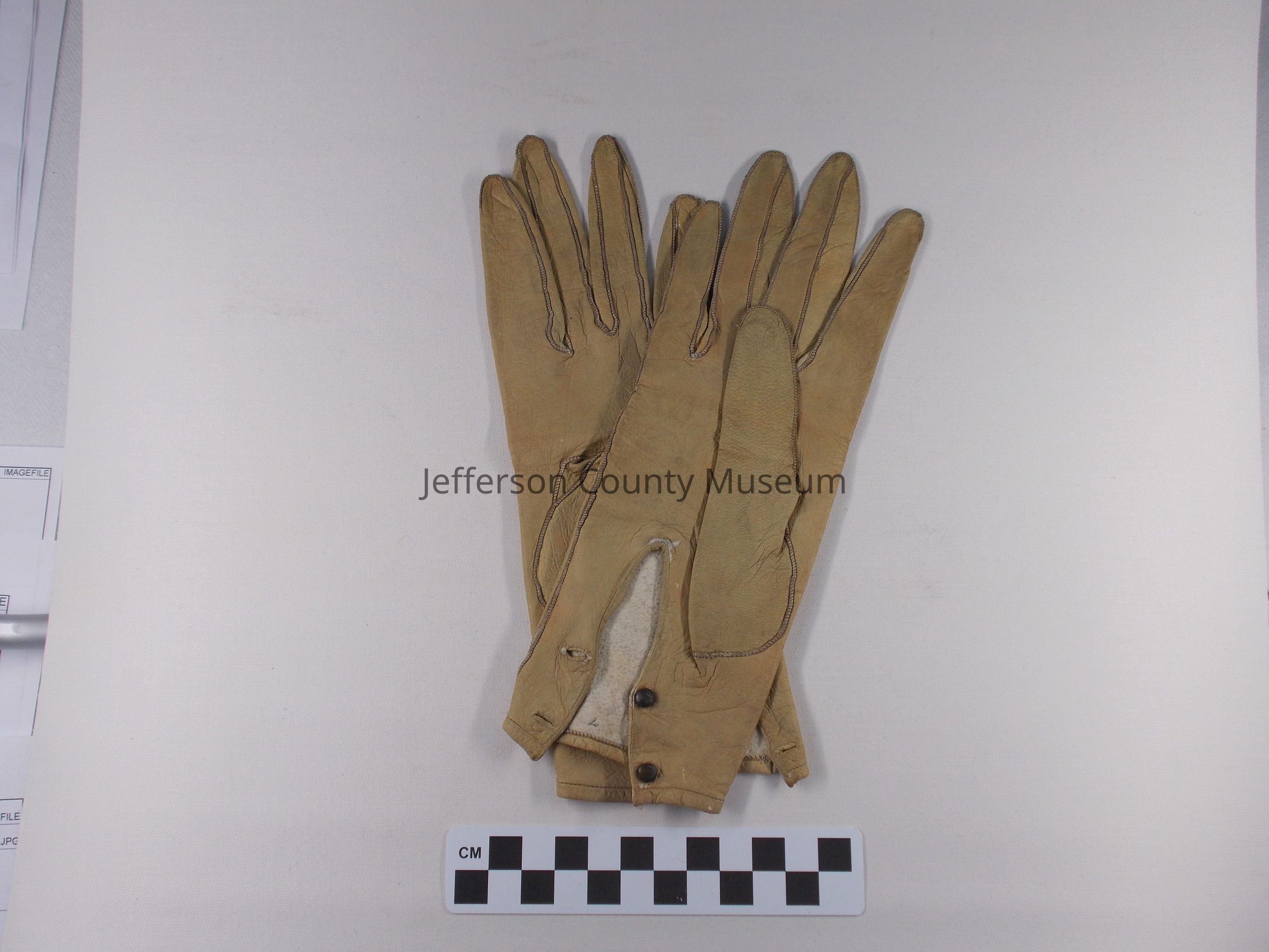 Pair of man's doeskin gloves, tan in color, for small hands. Two small brass buttons on each glove.Acquisition